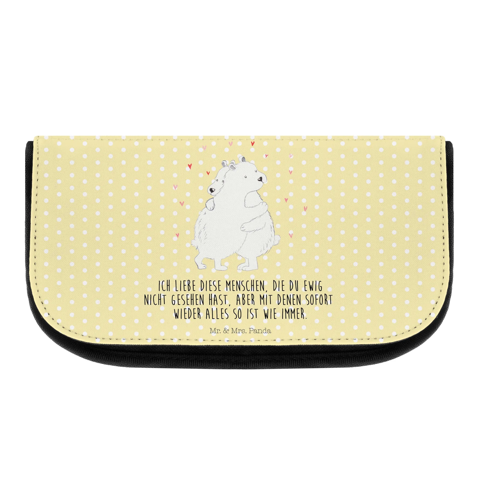 Auf der Vorderseite prangt das süße Motiv von zwei Eisbären, die sich innig umarmen, eine wunderschöne Darstellung von Liebe und Zuneigung. Jedes Detail des Motives ist mit viel Liebe und Hingabe von Mrs. Panda handgezeichnet. Jeden Blick auf die Kosmetiktasche erfreut dein Herz und lässt dich an die Menschen denken, die du vielleicht lange nicht gesehen hast, aber mit denen alles so ist wie immer. Sie bringt gute Laune und ein Lächeln, egal wo du bist.