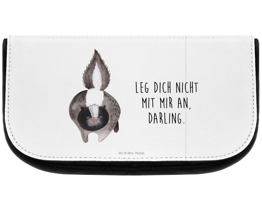 Die Kosmetiktasche "Stinktier Angriff" aus der Stinktier-Kollektion von Mr. & Mrs. Panda ist der perfekte Begleiter für alle Damen, die es lieben, ihre Schminksachen stilvoll zu verstauen. Diese einzigartige Kulturtasche besticht durch das niedliche und zugleich drohende Motiv eines Stinktiers, das mit seinem buschigen Schwanz in die Luft steht und den Slogan "Leg dich nicht mit mir an, Darling." prächtig zur Geltung bringt.