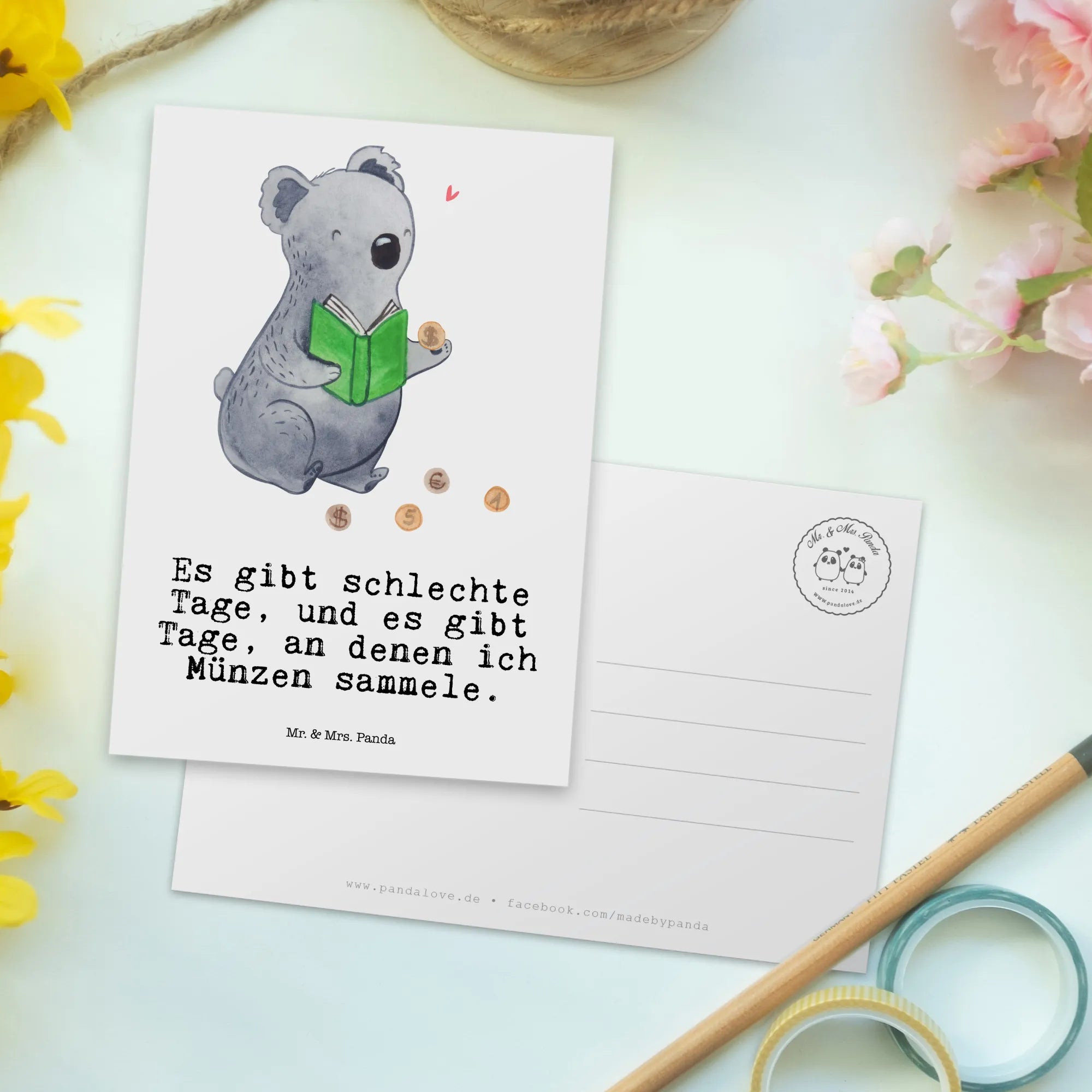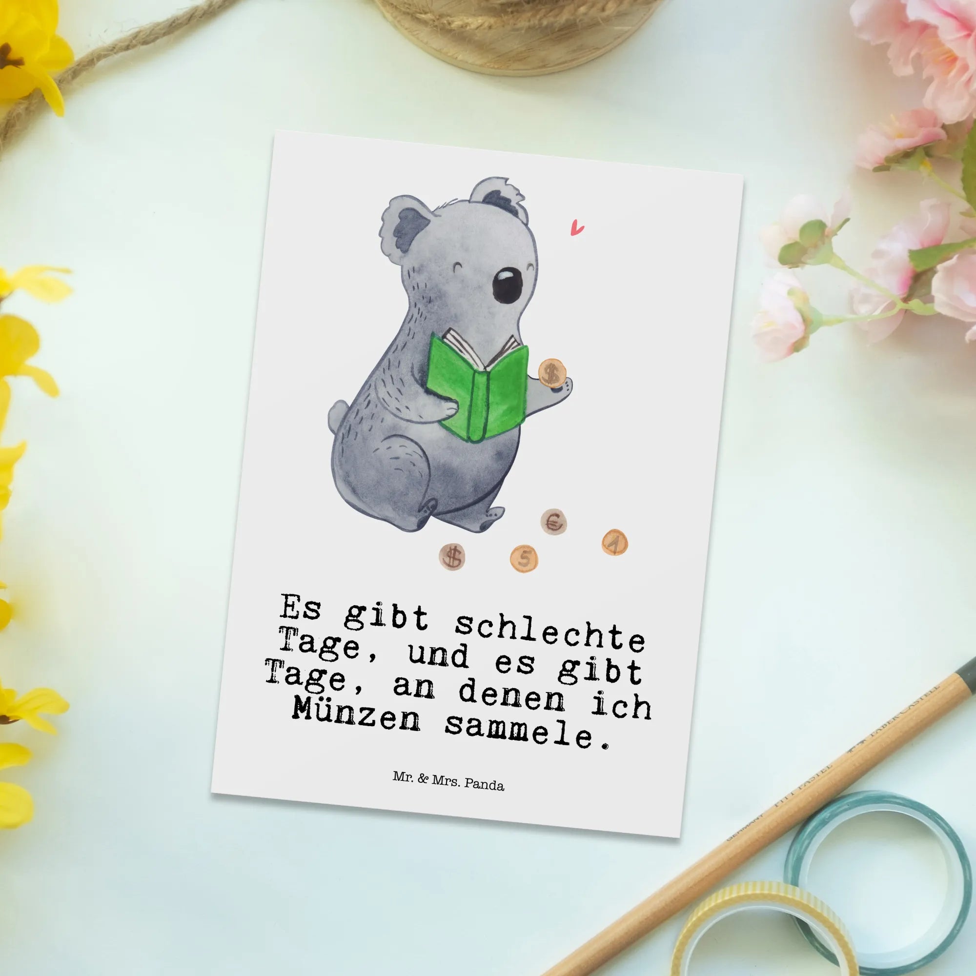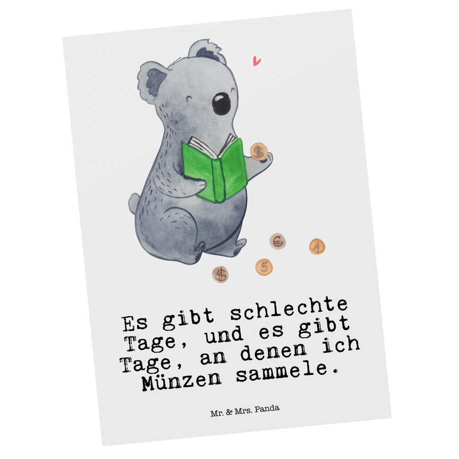Die perfekte Postkarte für Münzen-Sammler und Hobbyisten ist endlich da! Unsere liebevoll gestaltete Postkarte "Koala Münzen sammeln Tage" ist das ideale Geschenk für jeden, der die Welt der Numismatik begeistert. Sie zeigt einen niedlichen Koala, der mit leuchtenden Augen seine wertvolle Münzsammlung betrachtet. Mit dem witzigen Slogan "Es gibt schlechte Tage, und es gibt Tage, an denen ich Münzen sammele." bringt die Karte nicht nur Freude, sondern auch einen Hauch von Humor in jeden Briefkasten.