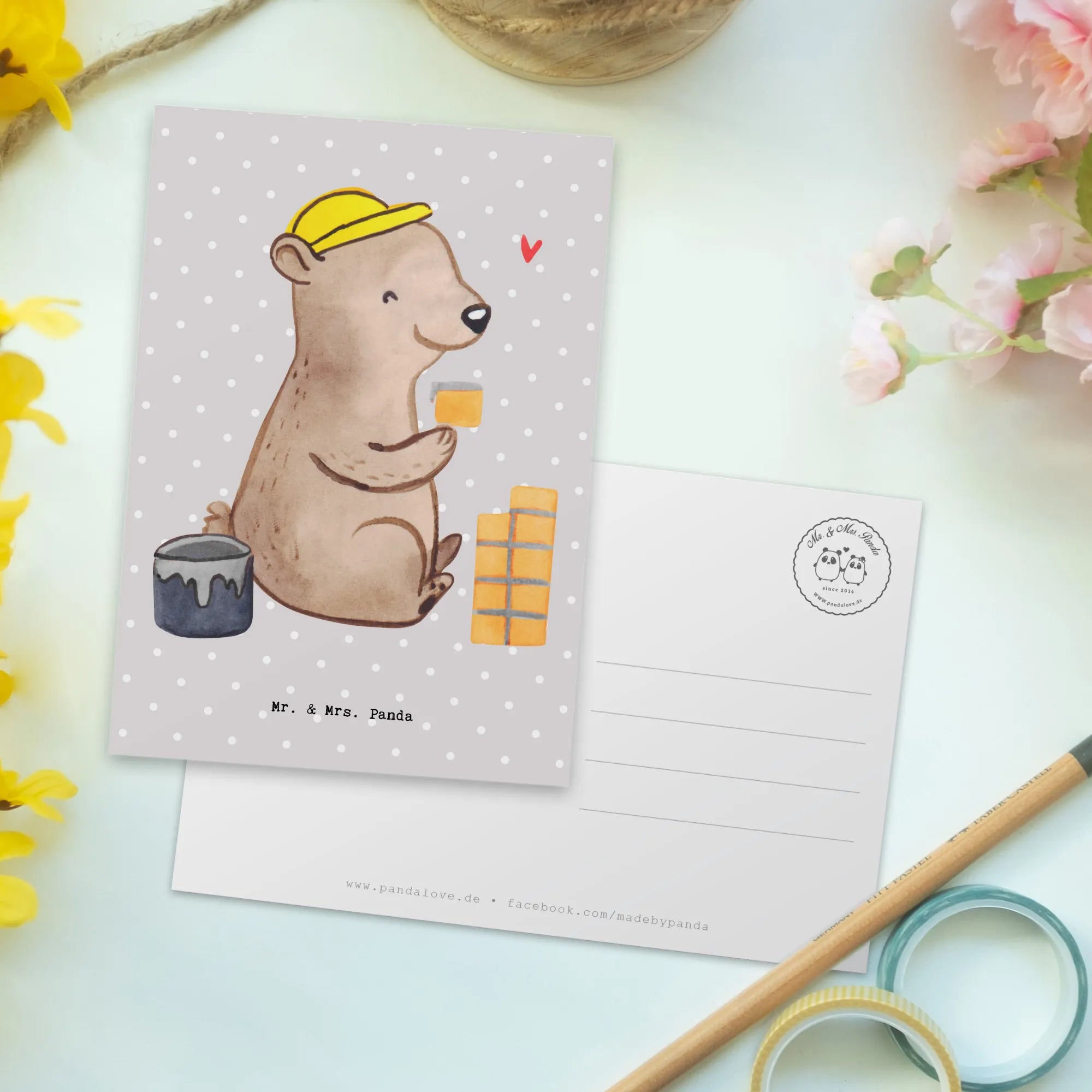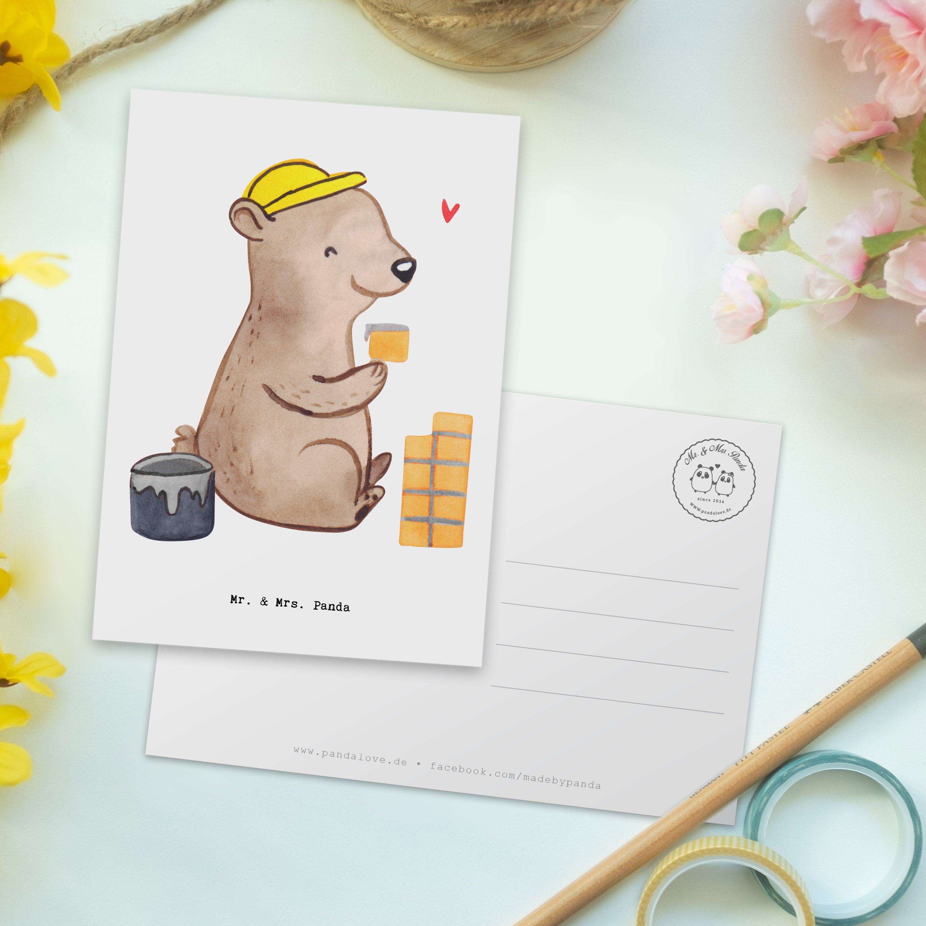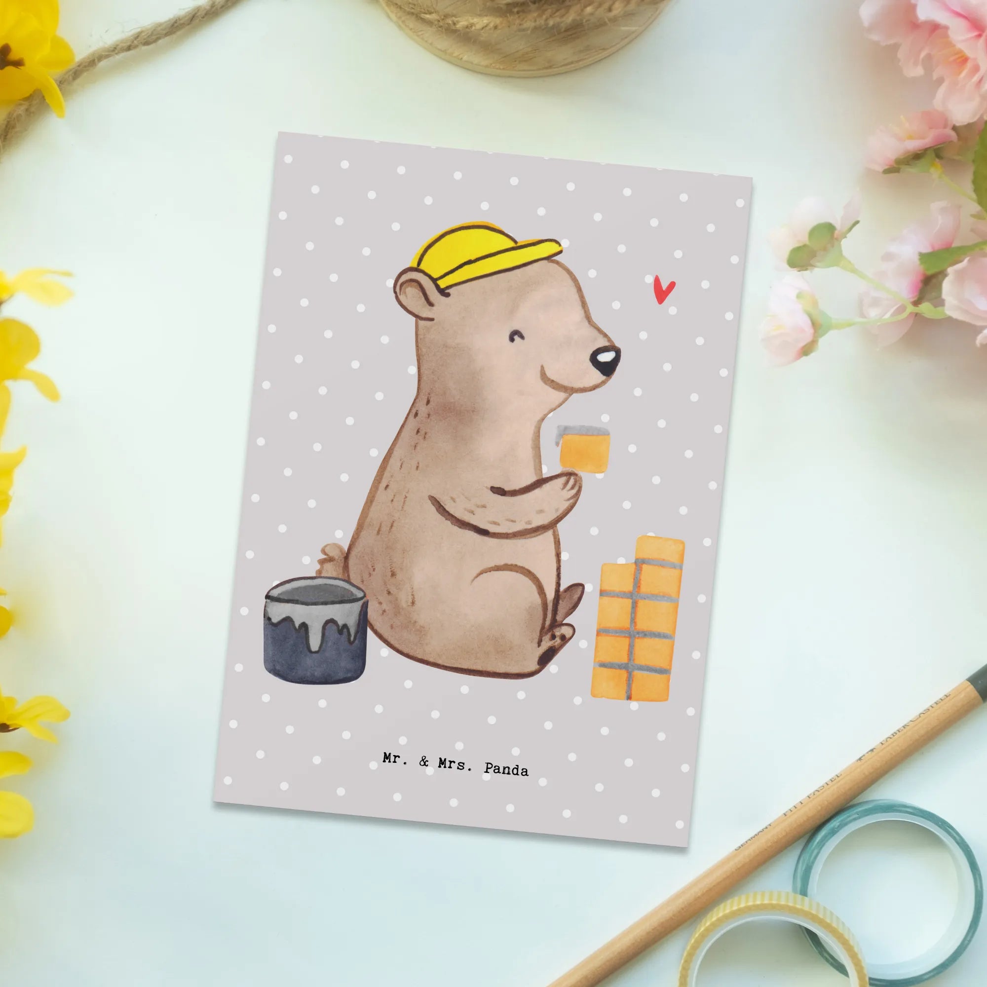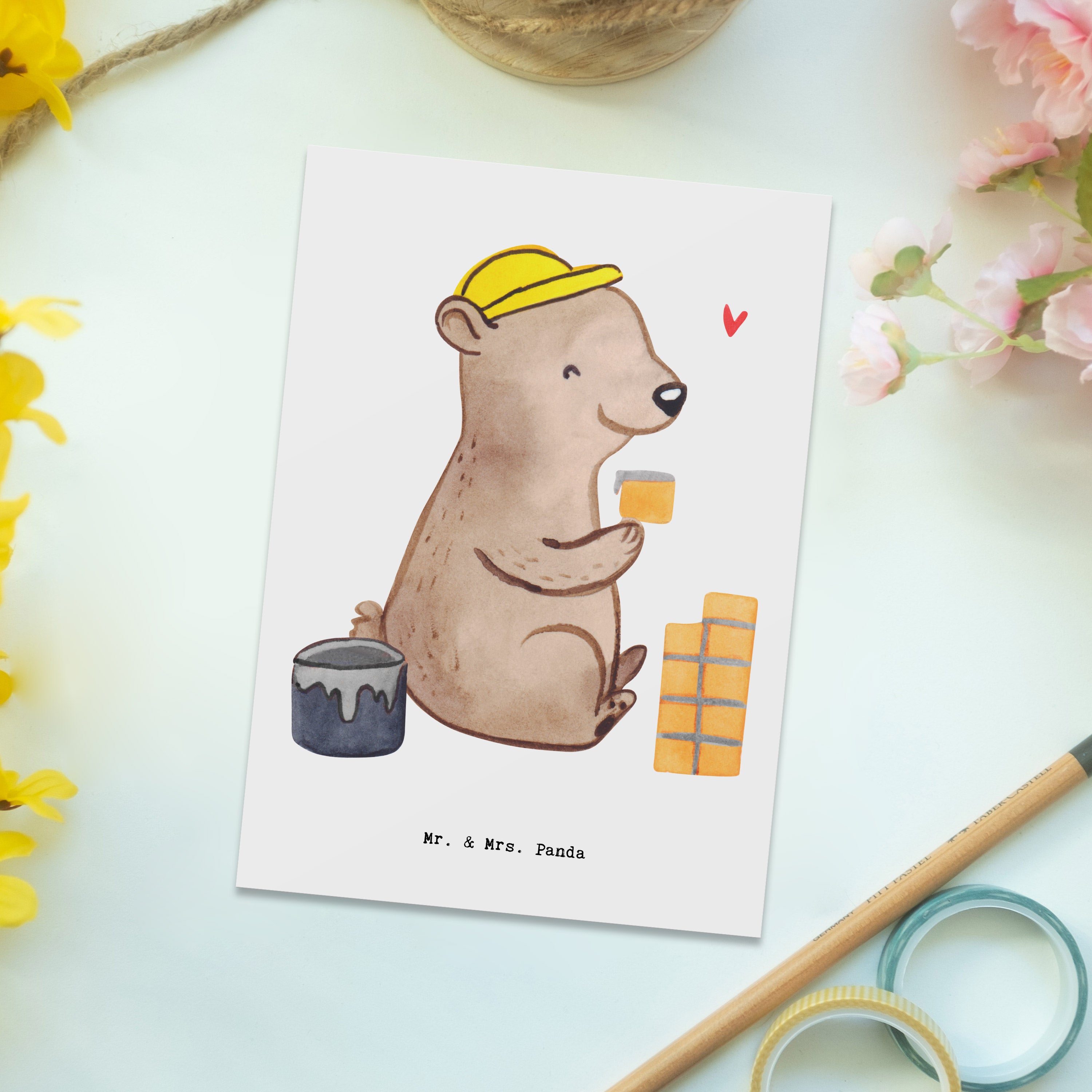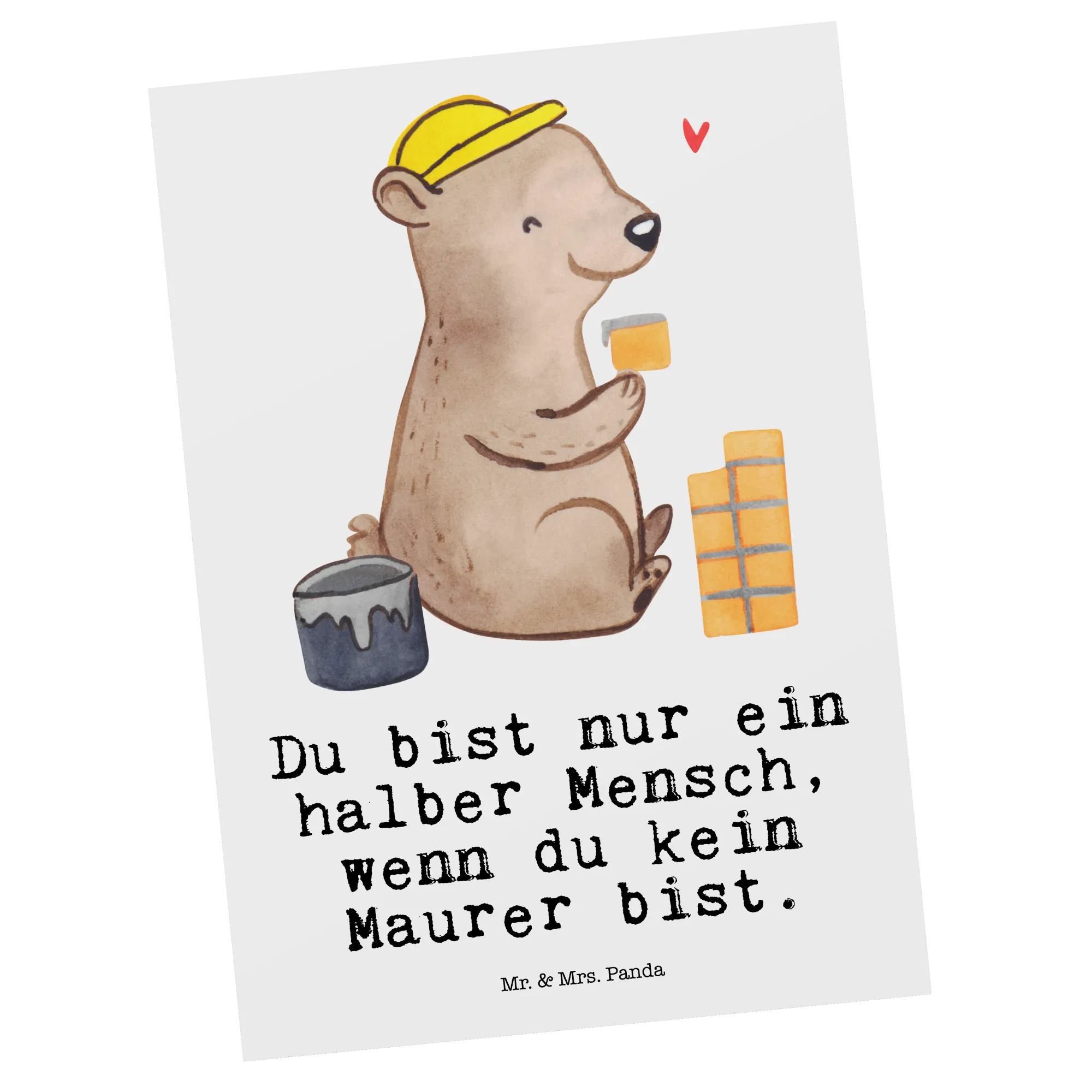 Die perfekte Postkarte für Maurer und Handwerker aus der kreativen Berufe Kollektion von Mr. & Mrs. Panda! Diese einzigartige Karte, hochwertig bedruckt mit dem süßen Motiv eines "Maurers mit Herz", ist nicht nur ein echter Hingucker, sondern auch eine wunderschöne Art, Deinen Dank auszudrücken oder jemanden zu feiern.