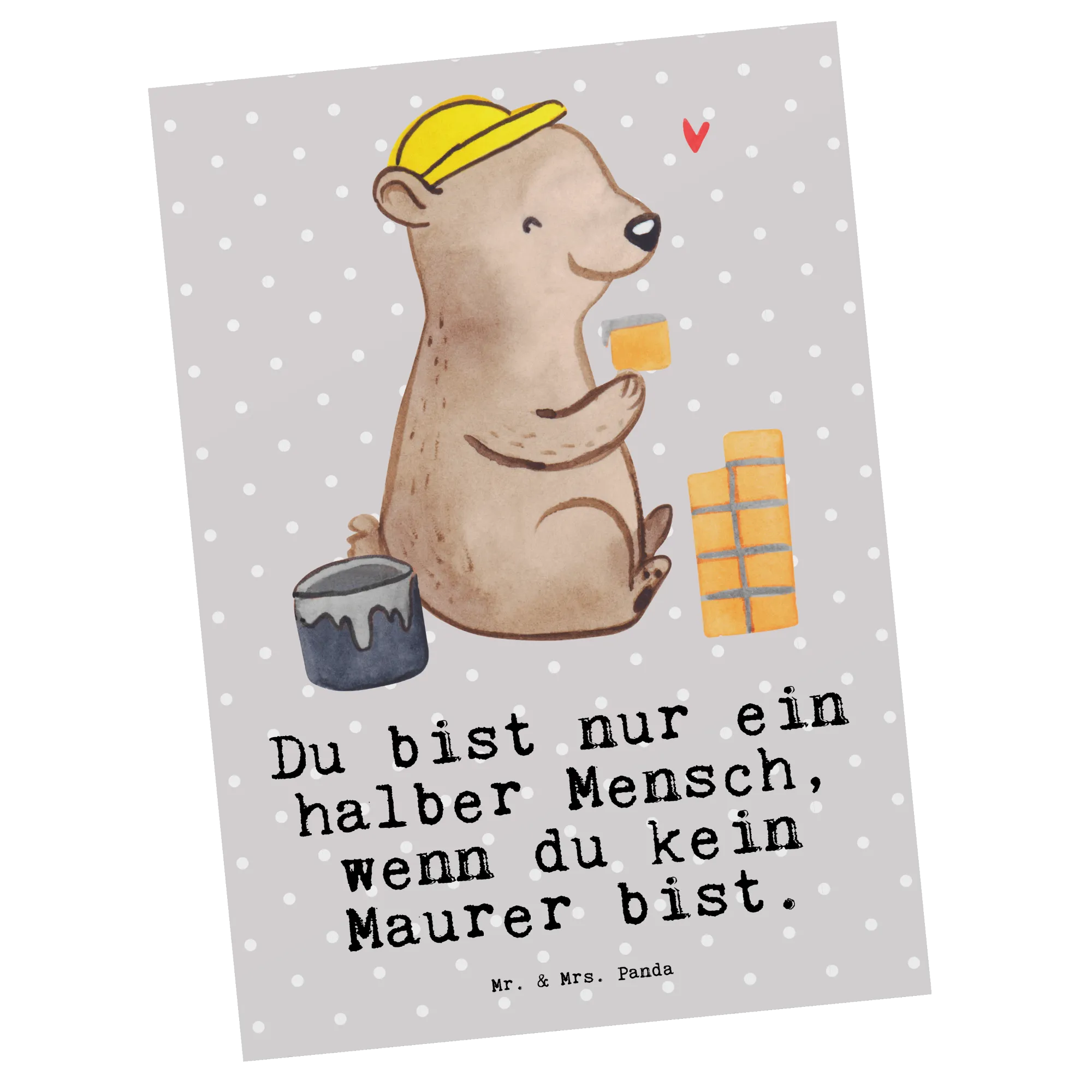 Entdecke die liebevolle Postkarte 'Maurer mit Herz' von Mr. & Mrs. Panda! Diese einzigartige Karte ist mehr als nur ein Stück Papier – sie ist das perfekte Geschenk für alle Handwerker und Maurermeister, die du kennst! Mit dem witzigen Spruch 'Du bist nur ein halber Mensch, wenn du kein Maurer bist', bringt sie dein Herz zum Schmelzen. Ideal für Anlässe wie Geburtstage, Jubiläen oder Abschiedsfeiern, sorgt diese Karte für ein Lächeln auf den Lippen und ein warmes Gefühl im Herzen.