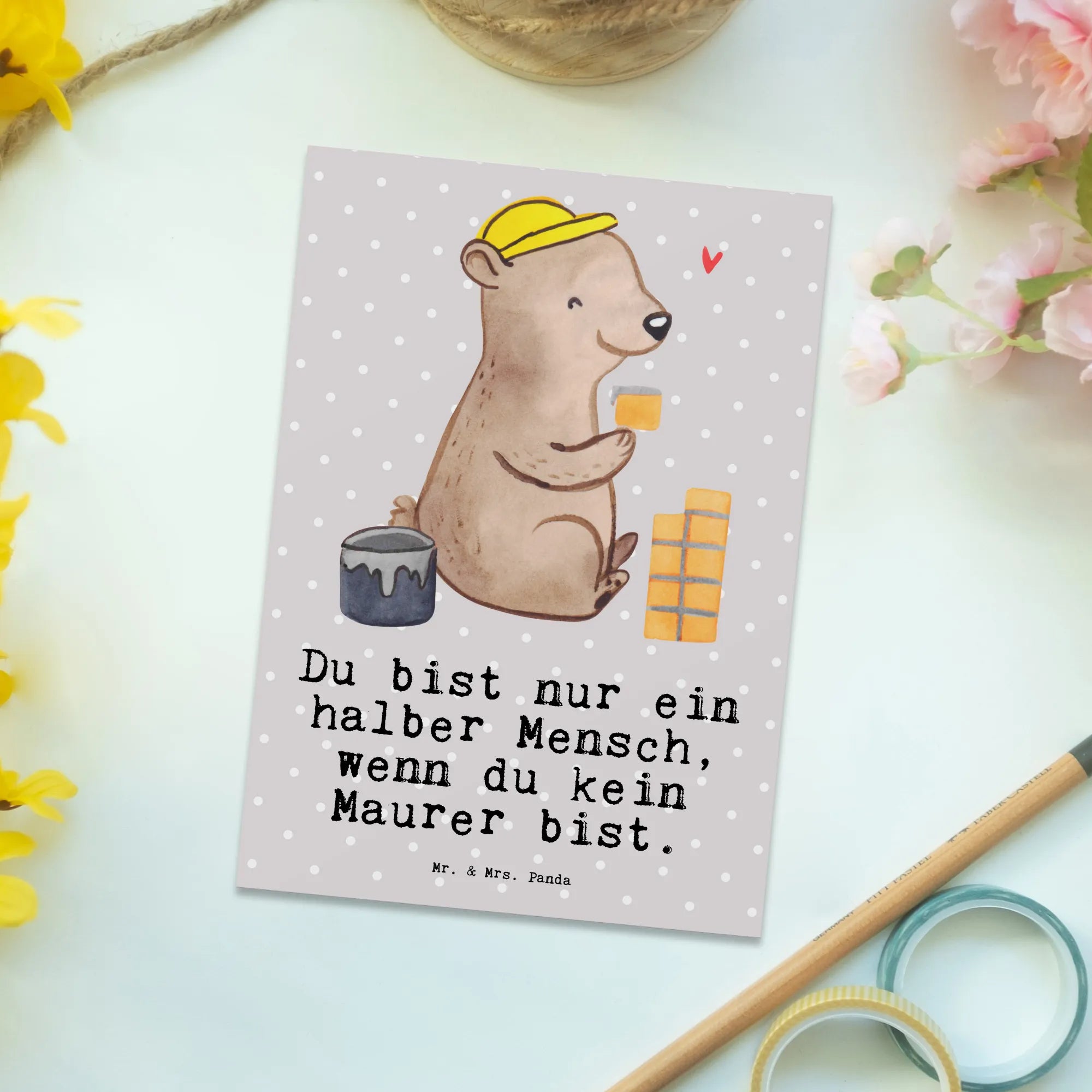Entdecke die bezaubernde Postkarte "Maurer mit Herz" aus der einzigartigen Berufe Kollektion von Mr. & Mrs. Panda! Diese liebevoll gestaltete Karte ist das perfekte Geschenk für alle Maurer und Maurermeister. Ob zum Ehrentag der Gesellenprüfung, als Dankeschön für einen geschätzten Arbeitskollegen oder als Abschiedsgeschenk für den ruhestandtreten Maurer – diese Postkarte trifft immer ins Herz.