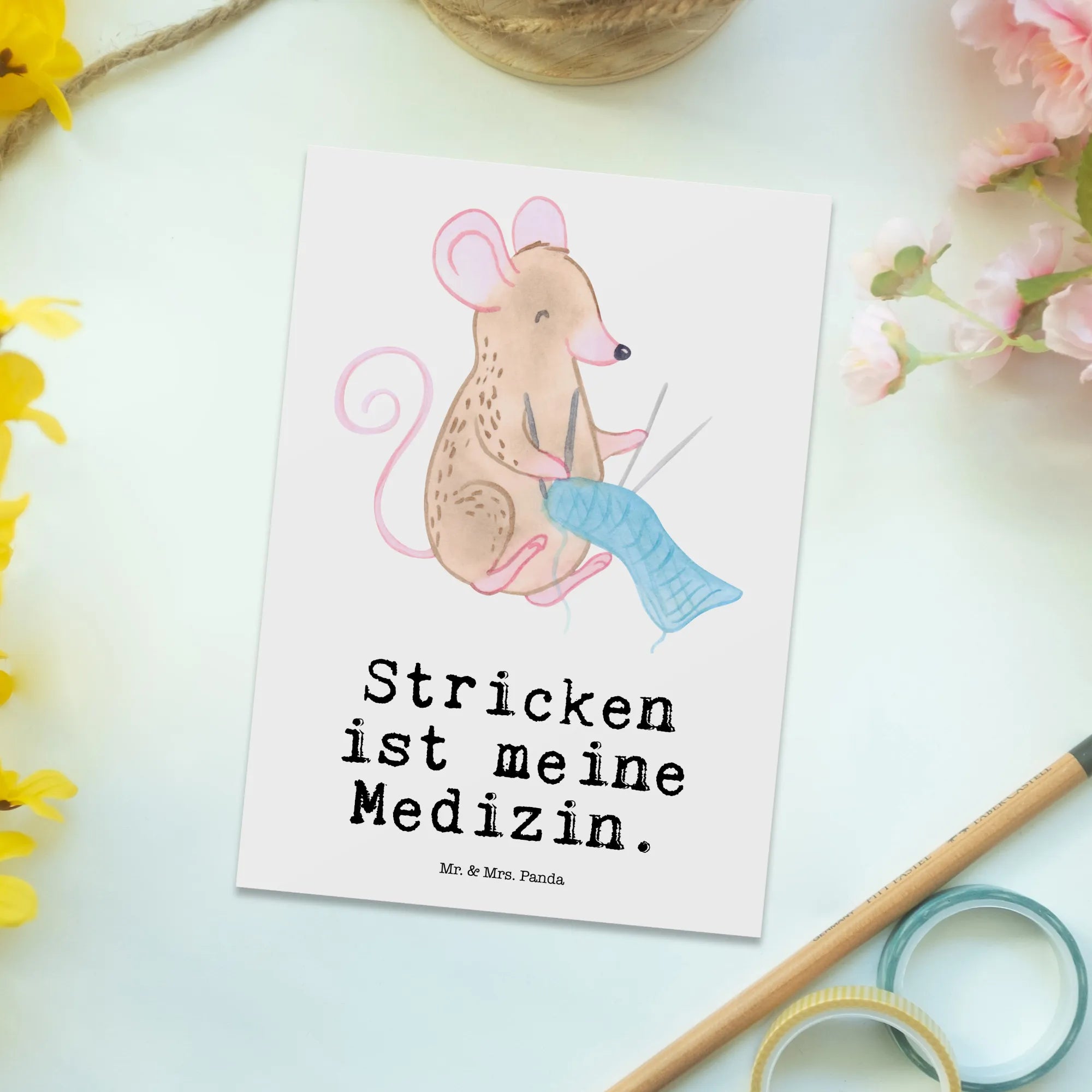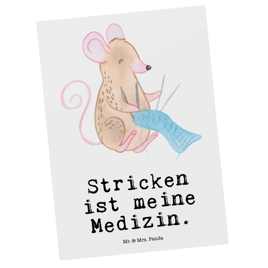 Die süße Postkarte "Maus Stricken Medizin" aus der Kollektion Hobby & Sport von Mr. & Mrs. Panda ist nicht nur ein Blickfang, sondern auch ein liebevoll gestaltetes Geschenk für alle Strickenthusiasten und Hobby-Fans!