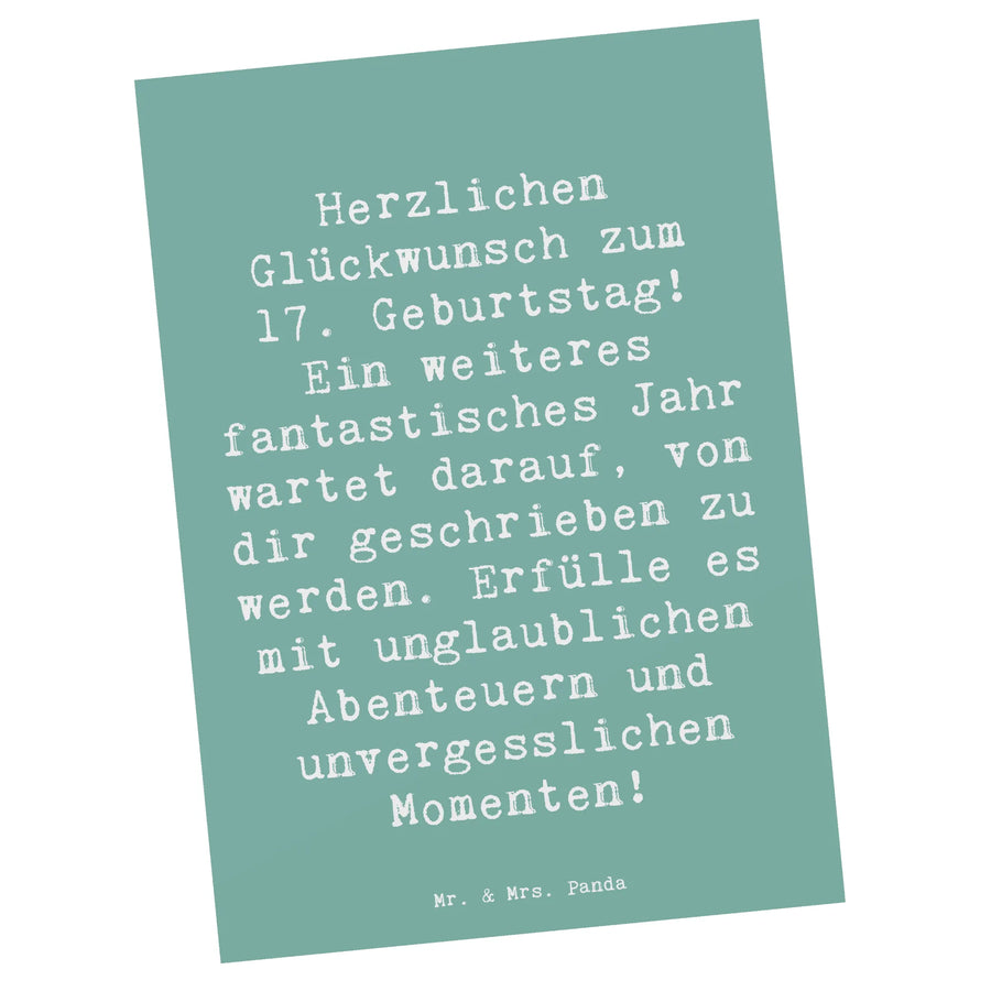Entdecke die bezaubernde Postkarte zum 17. Geburtstag von Mr. & Mrs. Panda! Diese einzigartige Postkarte ist die perfekte Wahl, um jemandem zu gratulieren, der seinen besonderen Tag feiert. Mit dem liebevoll gestalteten Motiv, das einen fröhlichen Glückwunsch beinhaltet, wird diese Karte garantiert ein Lächeln auf die Lippen des Geburtstagskindes zaubern.