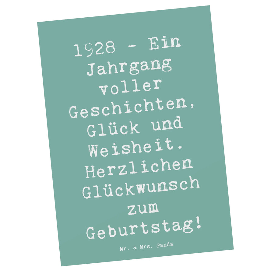 1928 - Ein Jahrgang voller Geschichten: Unsere Postkarte „1928 Geburtstag“ aus der Mr. & Mrs. Panda Geburtstagskollektion ist ein liebevoll gestalteter Gruß für Menschen, die 1928 geboren wurden. Der herzliche Spruch „1928 - Ein Jahrgang voller Geschichten, Glück und Weisheit. Herzlichen Glückwunsch zum Geburtstag!“ macht diese Karte zur perfekten Geburtstagskarte 1928, Grußkarte 1928 oder Geschenkidee zum Geburtsjahr.