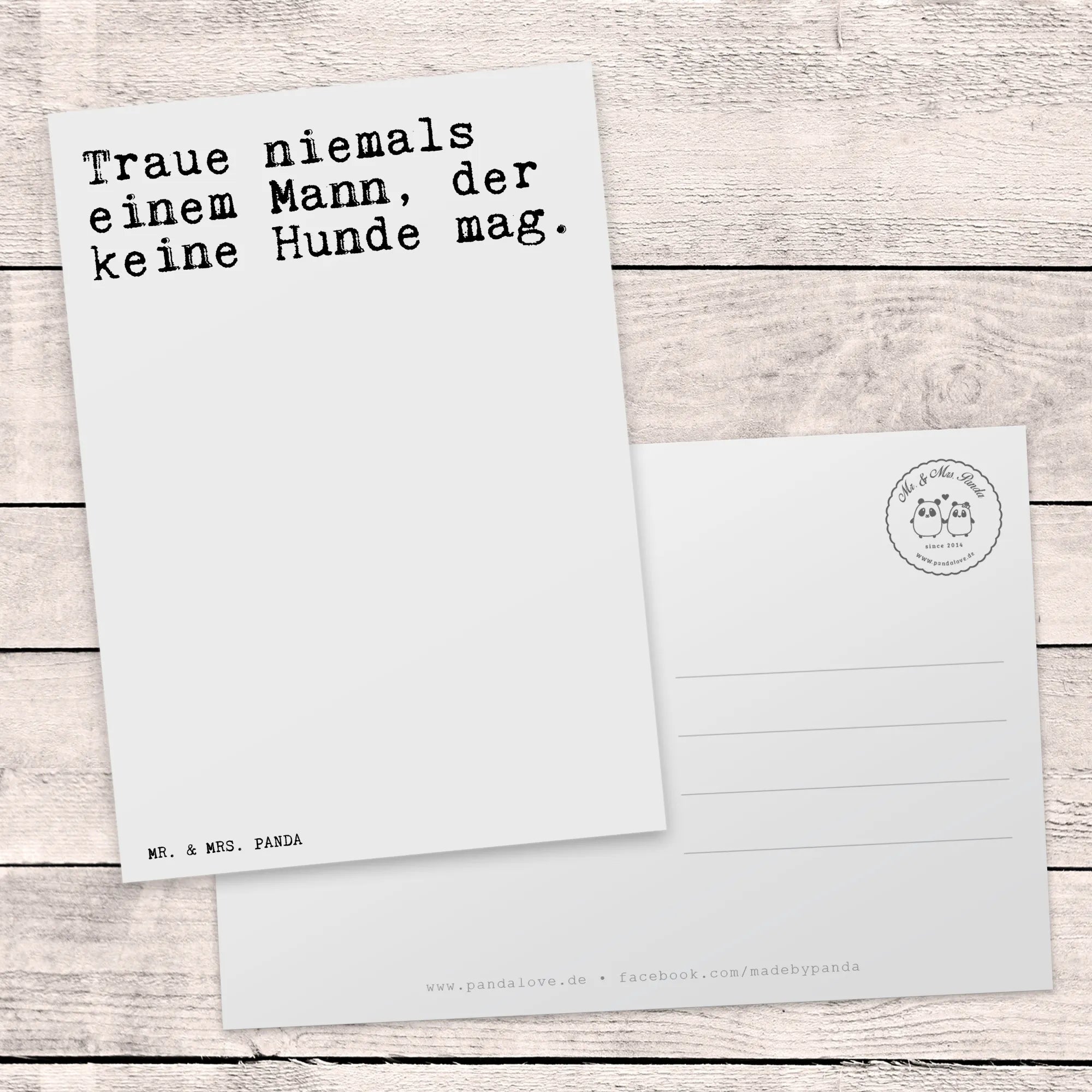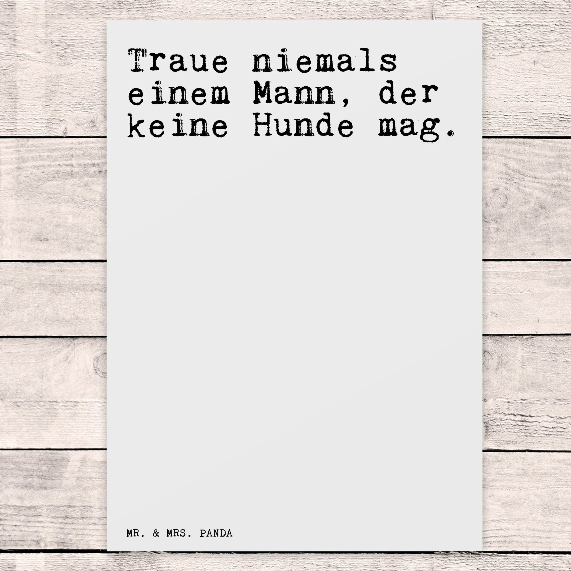 Die bezaubernde Postkarte mit dem Spruch "Traue niemals einem Mann, der keine Hunde mag" von Mr. & Mrs. Panda ist das ideale Geschenk für Hunde-Liebhaber und alle, die Humor und Liebe in einem besonderen Kartendesign schätzen. Diese einzigartige Postkarte ist nicht nur ein kleiner Gruß, sondern bringt auch ein Lächeln ins Gesicht.