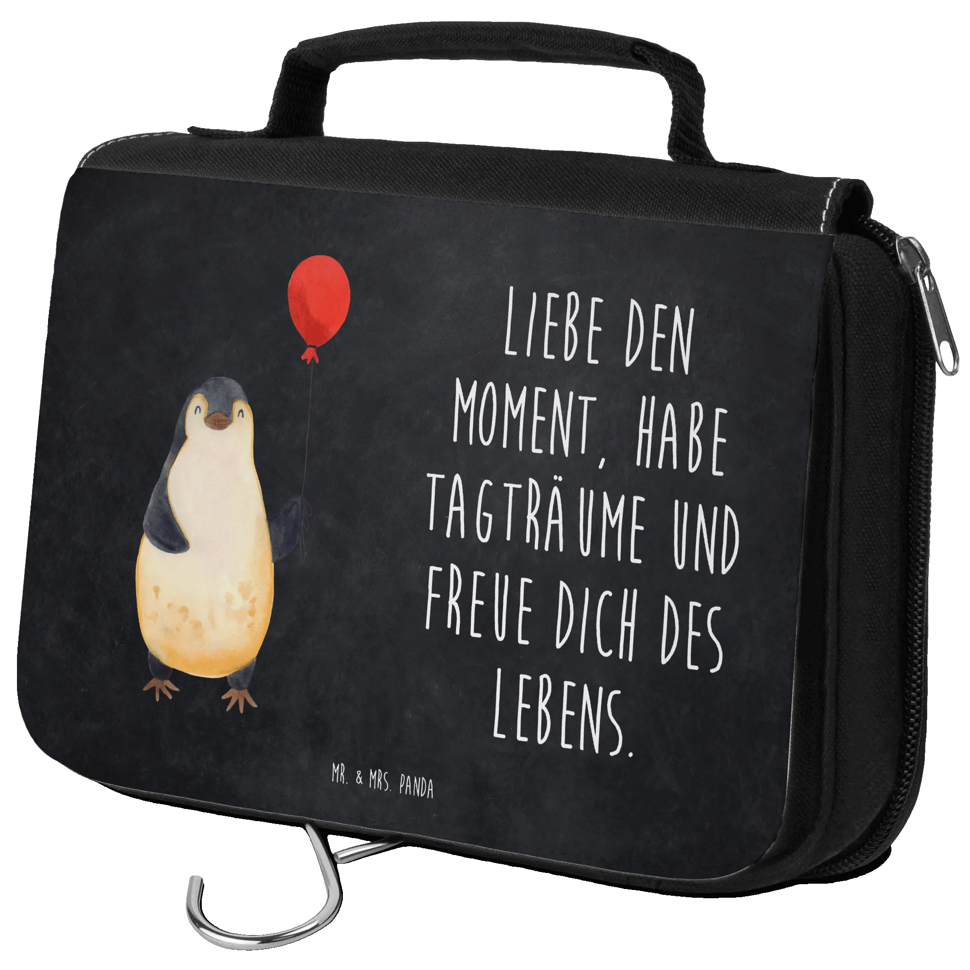 Der süße Pinguin mit dem bunten Luftballon bringt Lebenslust und Freude in deinen Alltag. Mit der Botschaft 'Liebe den Moment, habe Tagträume und freue dich des Lebens' inspiriert er zu einer positiven Lebenseinstellung. Ideal für Reisen oder das tägliche Leben, bietet dieser Kulturbeutel genügend Platz für all deine Kosmetik- und Hygieneprodukte.