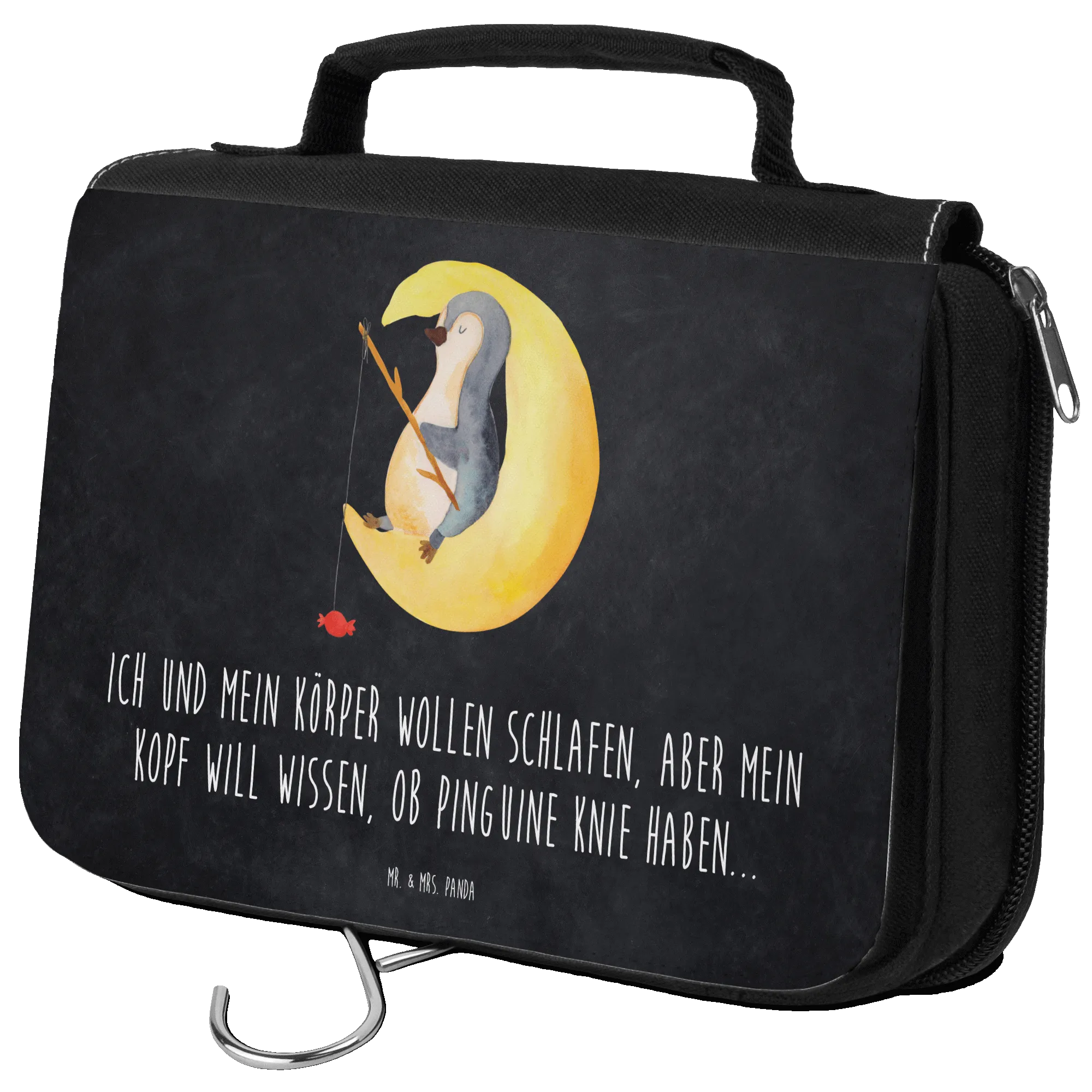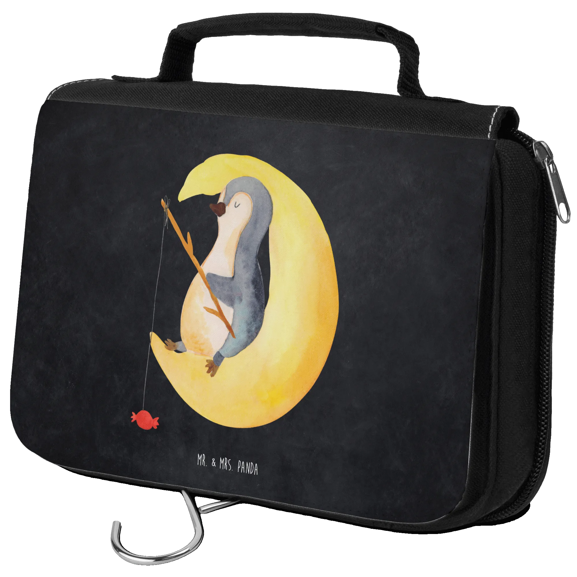 Die durchdachte Innenaufteilung mit einer großen Innentasche sowie einer externen Netzfächer sorgt dafür, dass du alles schnell griffbereit hast. Der süße Pinguin, der entspannt auf einer Mondsichel liegt und angelt, verleiht diesem Kulturbeutel eine charmante Note, die sowohl Damen als auch Herren begeistern wird.