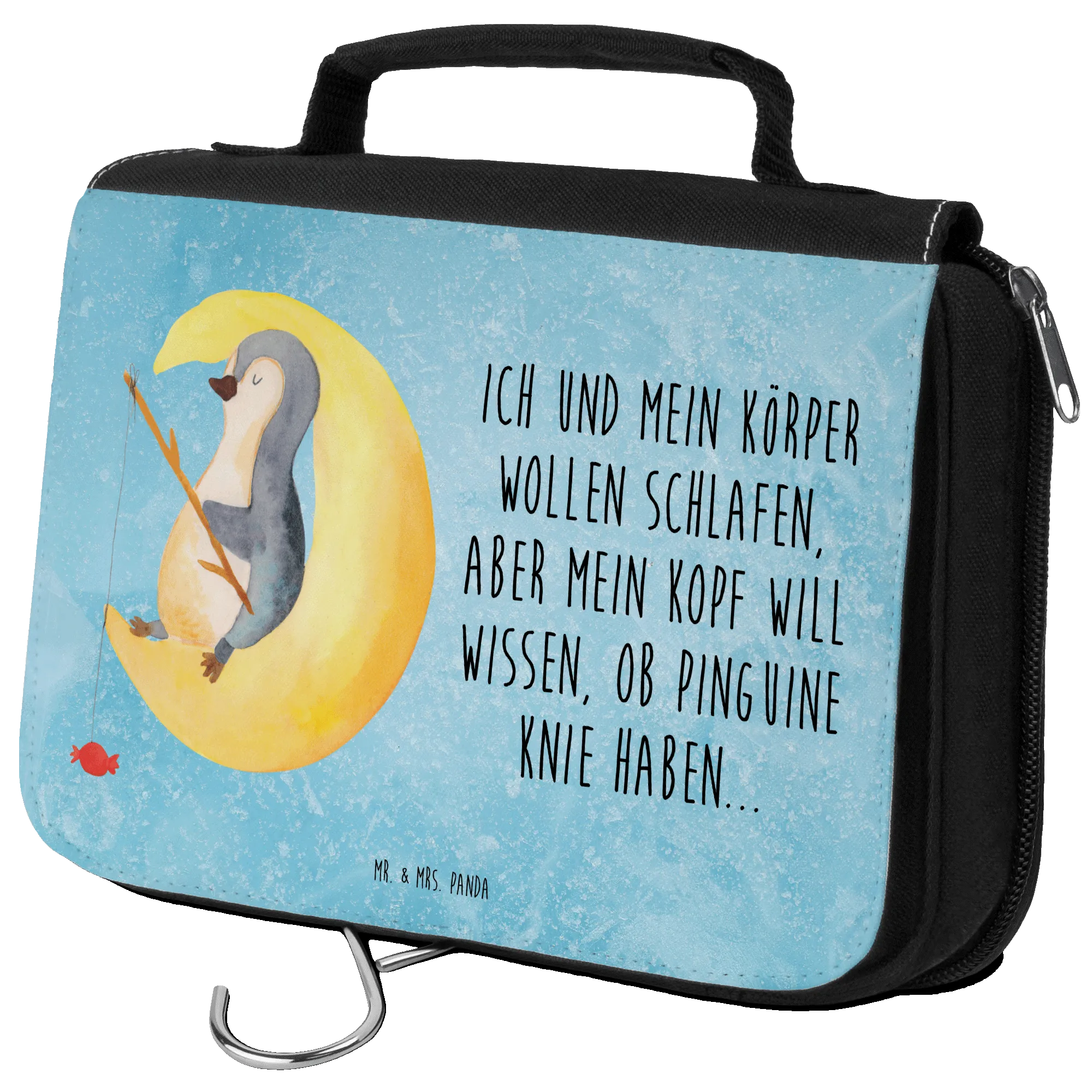 Entdecke den perfekten Kulturbeutel aus der Pinguin-Kollektion von Mr. & Mrs. Panda, der mit einem liebevoll gestalteten Pinguin-Motiv verziert ist! Dieser Kulturbeutel ist nicht nur praktisch, sondern auch ein echter Hingucker. Mit dem Slogan "Ich und mein Körper wollen schlafen, aber mein Kopf will wissen, ob Pinguine Knie haben..." bringt er humorvolle Leichtigkeit in deinen Alltag.