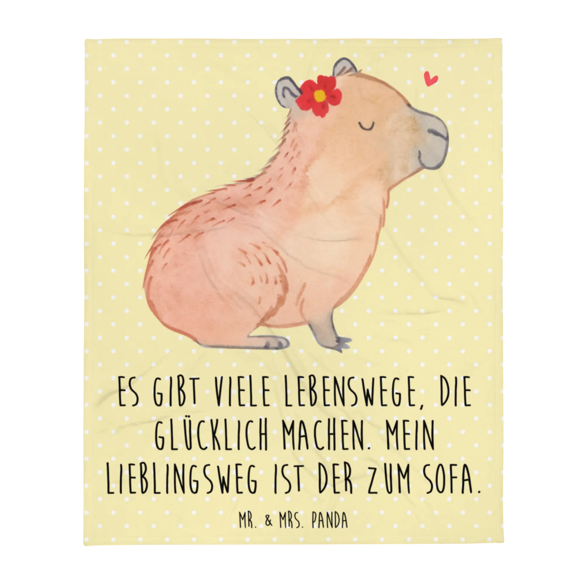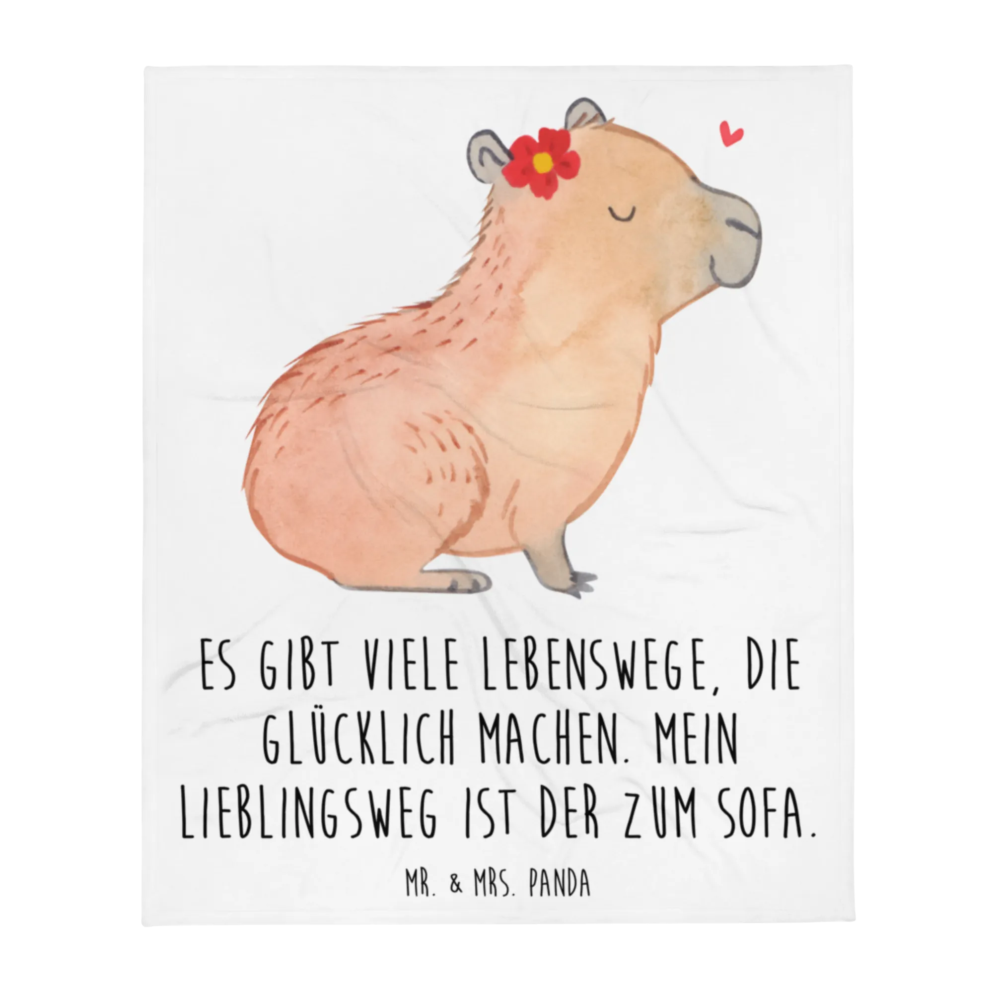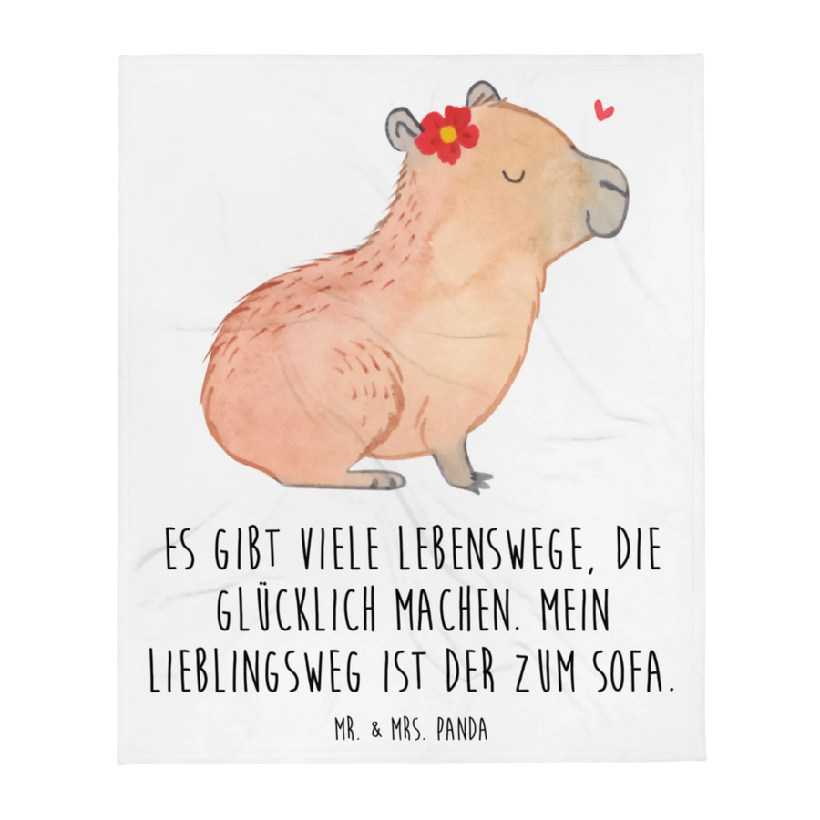 Herzlich willkommen in der Welt von Mr. & Mrs. Panda, wo kleine Freuden und tiefe Entspannung ganz groß geschrieben werden! Auf diesem charmanten Motiv siehst du ein süßes Capybara, das so entspannt aussieht, als gäbe es keinen Stress auf der Welt. Mit geschlossenen Augen und einem sanften Lächeln liegt es da und genießt den Moment, während eine rote Blume mit gelber Mitte frech auf seinem Kopf thront. Diese kleine Blume verleiht dem Capybara einen fröhlichen und verspielten Ausdruck, der einfach zum Schmunzeln einlädt. Und als ob das nicht genug wäre, schwebt ein kleines Herz über dem lieben Tierchen, was die liebevolle Atmosphäre perfekt unterstreicht. Der sanfte Farbauftrag der Illustration vermittelt zusätzlich ein Gefühl von Ruhe und Zufriedenheit. Der Spruch 'Es gibt viele Lebenswege, die glücklich machen. Mein Lieblingsweg ist der zum Sofa.' spiegelt diese Ruhe wundervoll wider und lädt dazu ein, dem Capybara auf seinen Lieblingweg zu folgen.