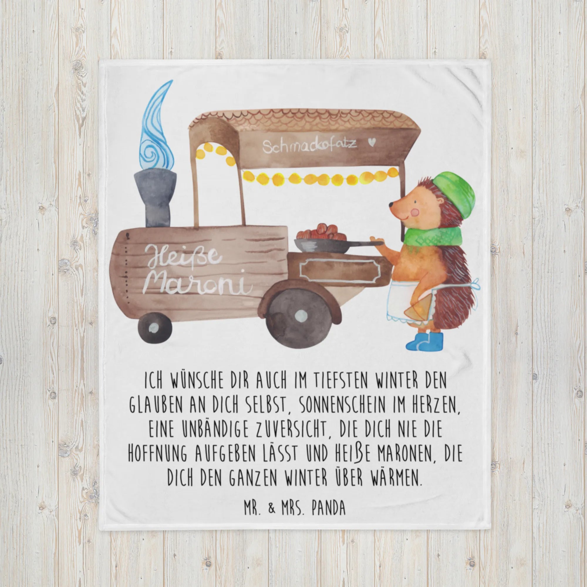 Das wunderschöne Motiv zeigt einen kleinen, liebevoll gezeichneten Igel, der mit seinen blauen Stiefeln, dem grünen Schal und der passenden Mütze perfekt für den Besuch auf dem Weihnachtsmarkt gerüstet ist. Er trägt eine niedliche weiße Schürze und steht stolz vor seinem kleinen Wagen, in dem er heiße Maronen schwenkt. Man kann das Knistern des Feuers und den herrlichen, nussigen Duft der gerösteten Kastanien förmlich wahrnehmen. Jedes Detail wurde von Mrs. Panda mit viel Hingabe handgezeichnet. Ob als Tagesdecke auf deinem Bett oder als Sofadecke für ausgiebige Filmabende – dieser kleine Igel bringt Freude in jeden Raum. 🦔🌰
