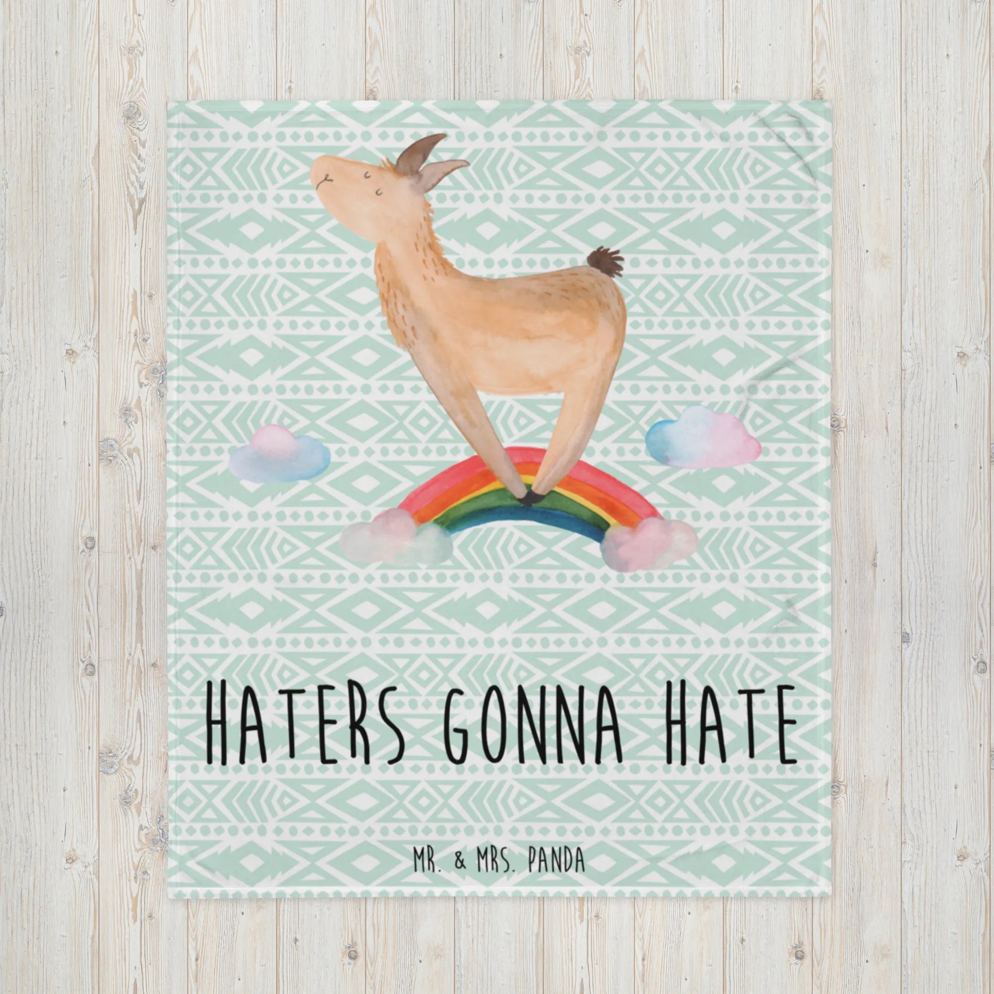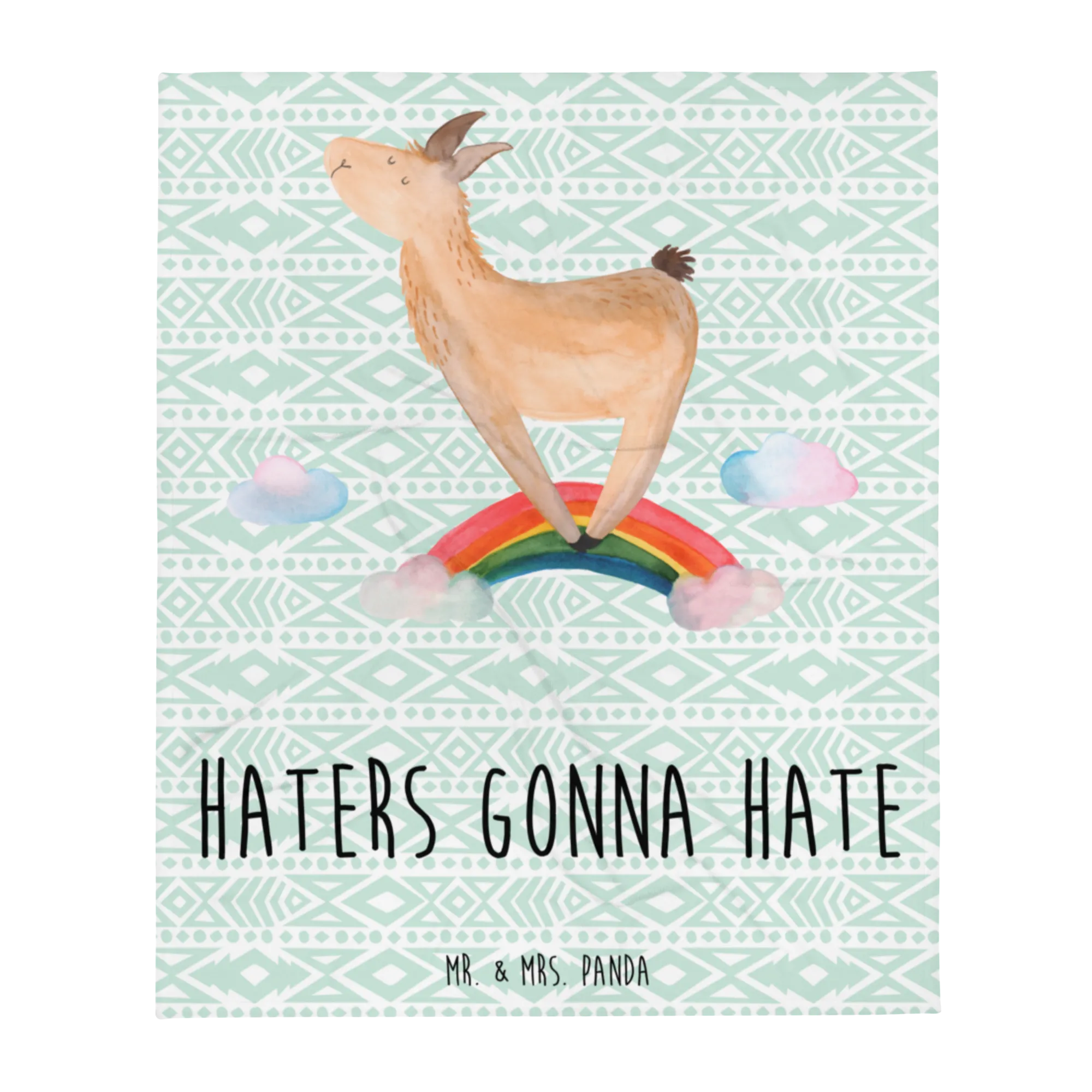 Couchdecke Lama Regenbogen - mit Spruch - Aztekenblau