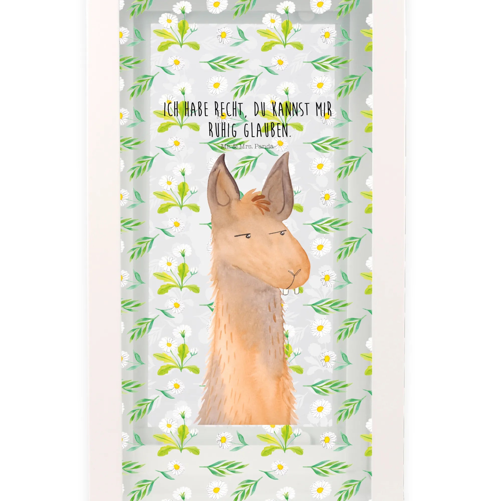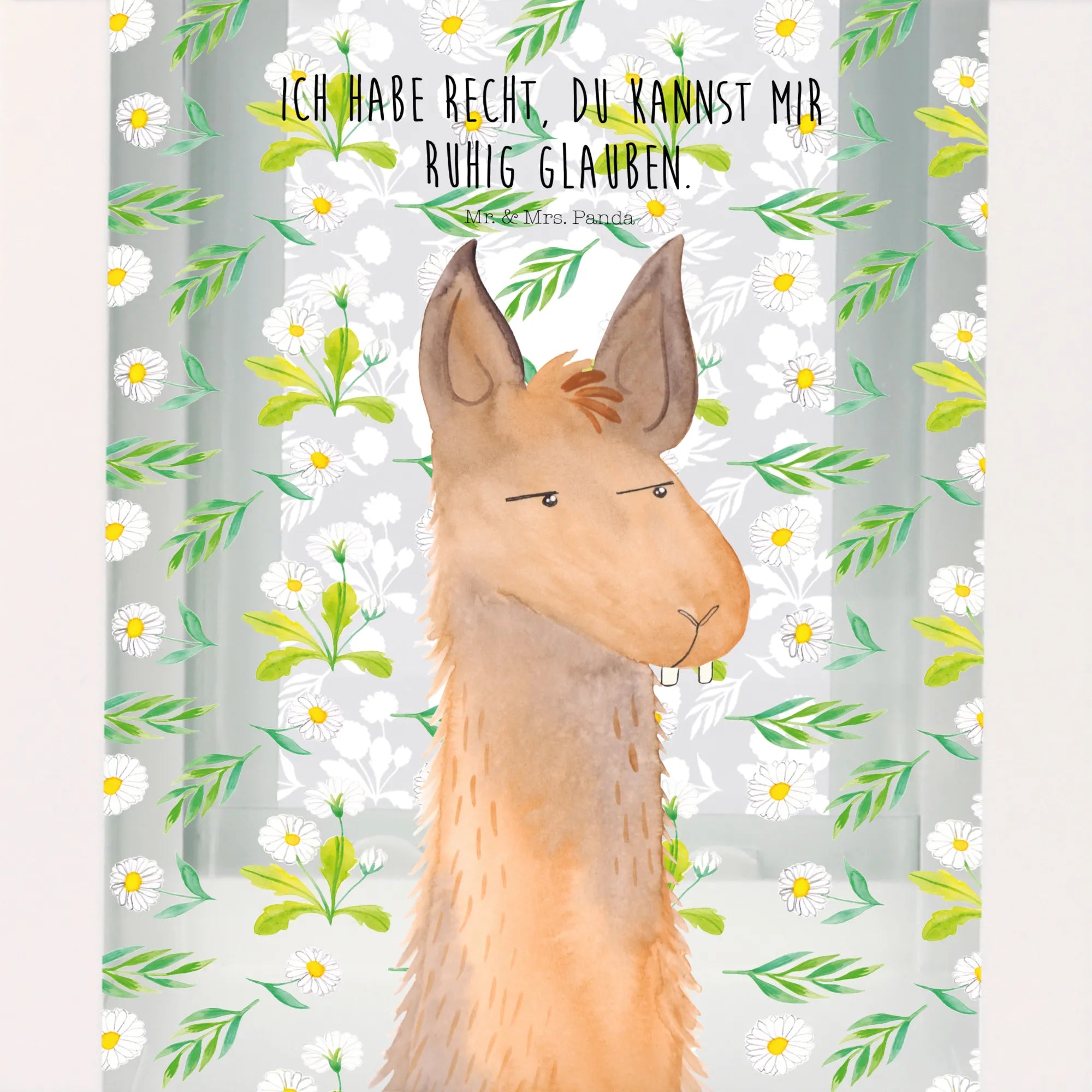 Die Deko Laterne zeigt einen genervt blickenden Lamakopf und gehört zur speziellen Lama-Kollektion von Mr. & Mrs. Panda. Lamas sind die Königstiere der Tierwelt und bringen einen Hauch der Coolness in deinen Garten! Diese Laterne ist ideal, um Freude zu verbreiten und ist dabei ein tolles Geschenk für Freunde, beste Freundinnen oder sogar für den Chef oder die Chefin im Büroalltag. Sie bringt ein Lächeln in jedes Büro und läutet die Entspannung ein, sobald die Arbeitszeit vorbei ist.
