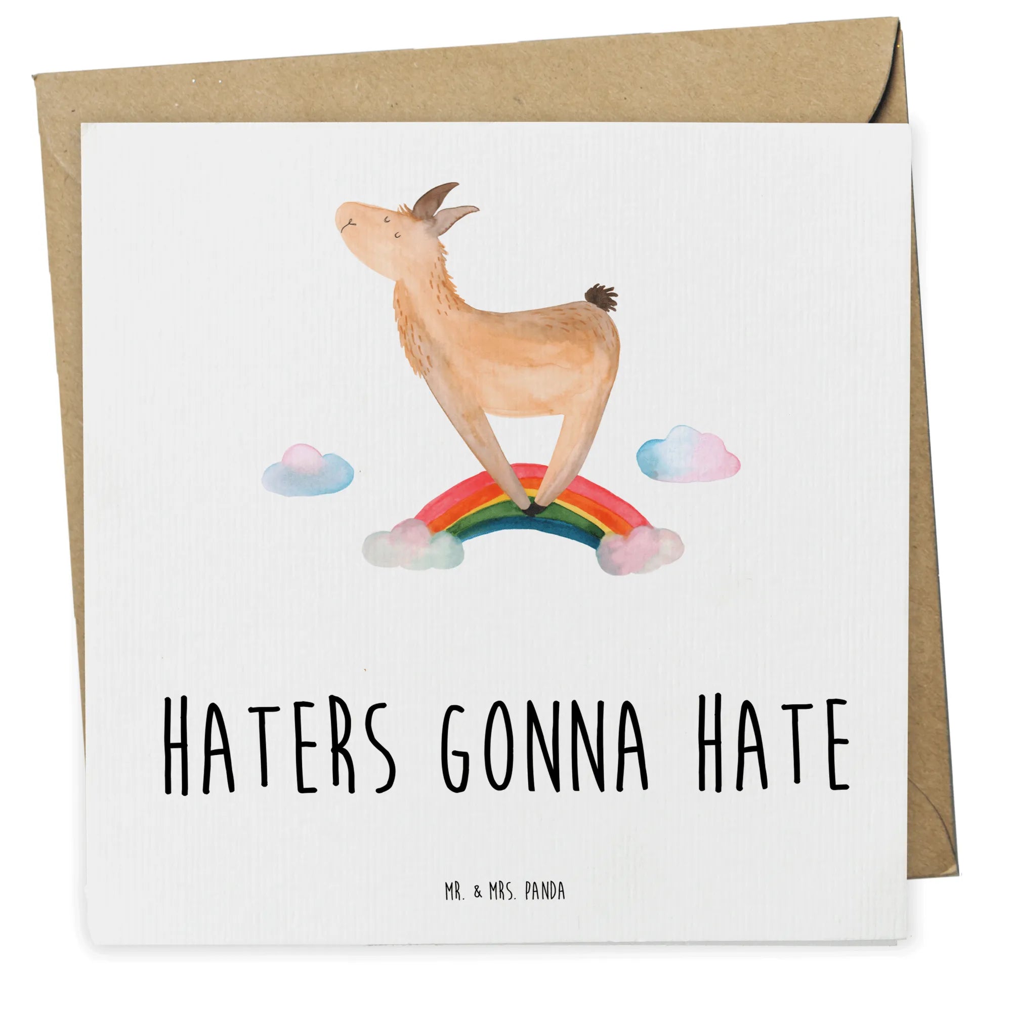 Auf der Vorderseite springt ein süßes Lama, das voller Energie und Coolness über einen bunten Regenbogen hüpft. Diese genau die richtige Karte für Menschen, die eine Vorliebe für das Besondere haben und sich gegen Hater und Neider behaupten möchten! Der Spruch 'Haters gonna hate' auf der Vorderseite bringt das Lebensgefühl der inneren Freiheit und Unabhängigkeit prima auf den Punkt.