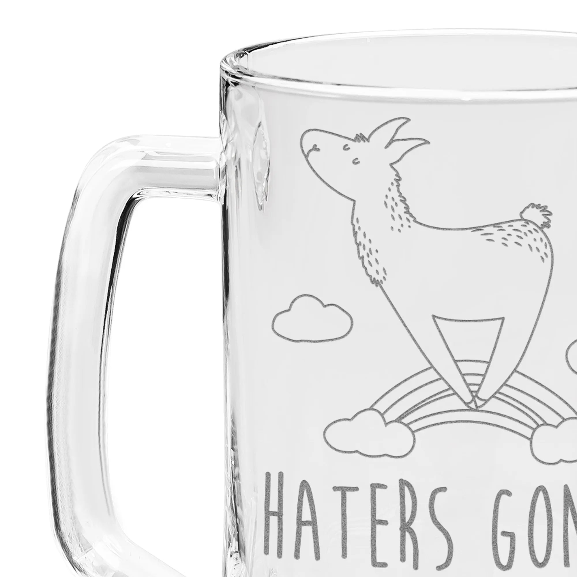 Die hochwertige Lasergravur sorgt dafür, dass der Schriftzug 'Haters gonna hate' auf dem robusten Glas nicht nur toll aussieht, sondern auch lange haltbar ist. Jeder Schluck Bier wird zu einem besonderen Erlebnis, während das niedliche Lama im bunten Regenbogen über den Krug hüpft. Das Lama ist nicht nur süß, sondern auch genau das richtige Motiv für Esthetikliebhaber, die das Außergewöhnliche schätzen!