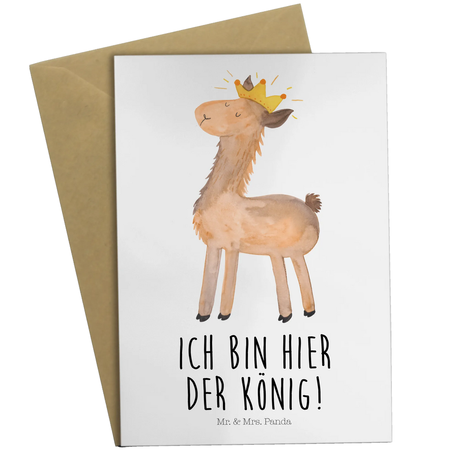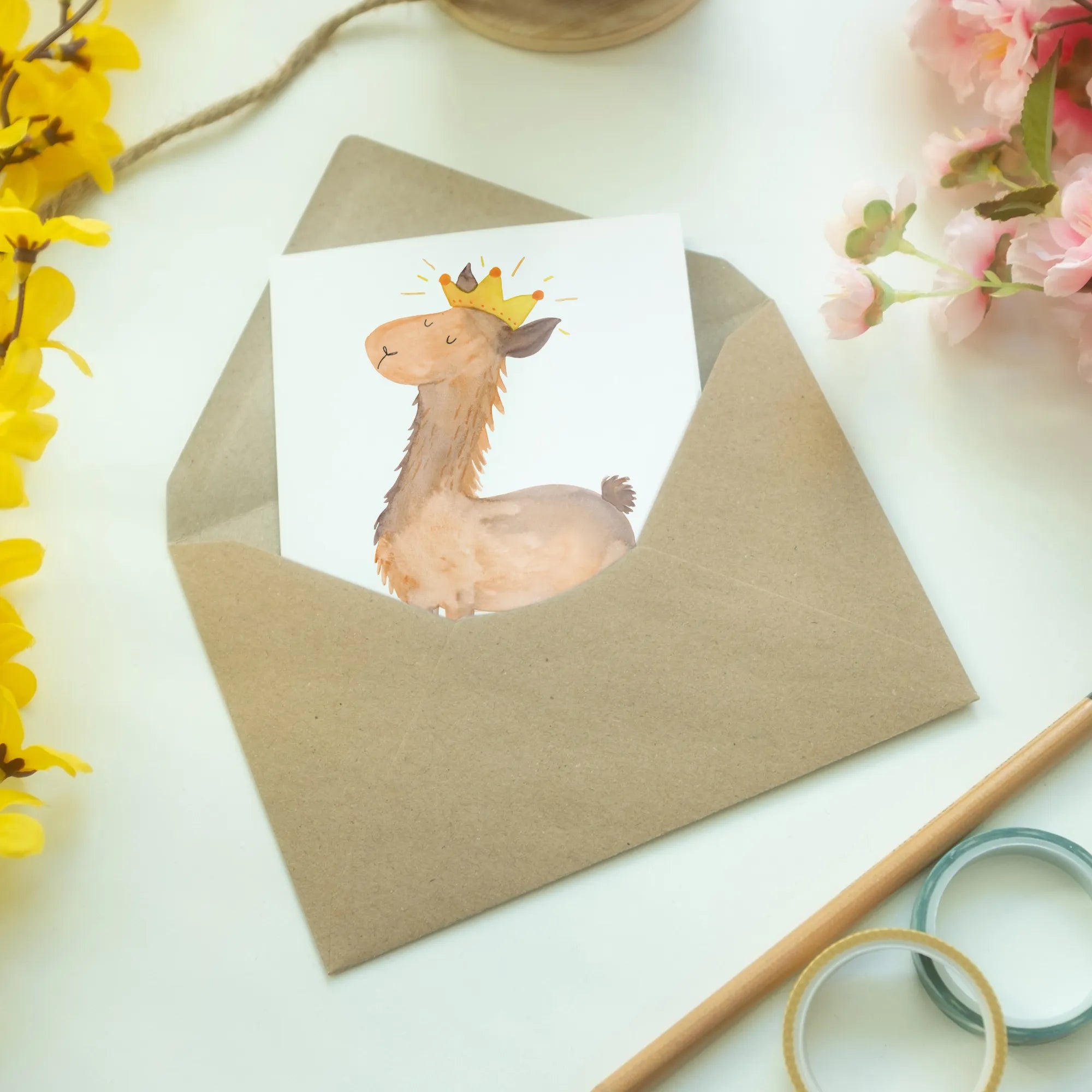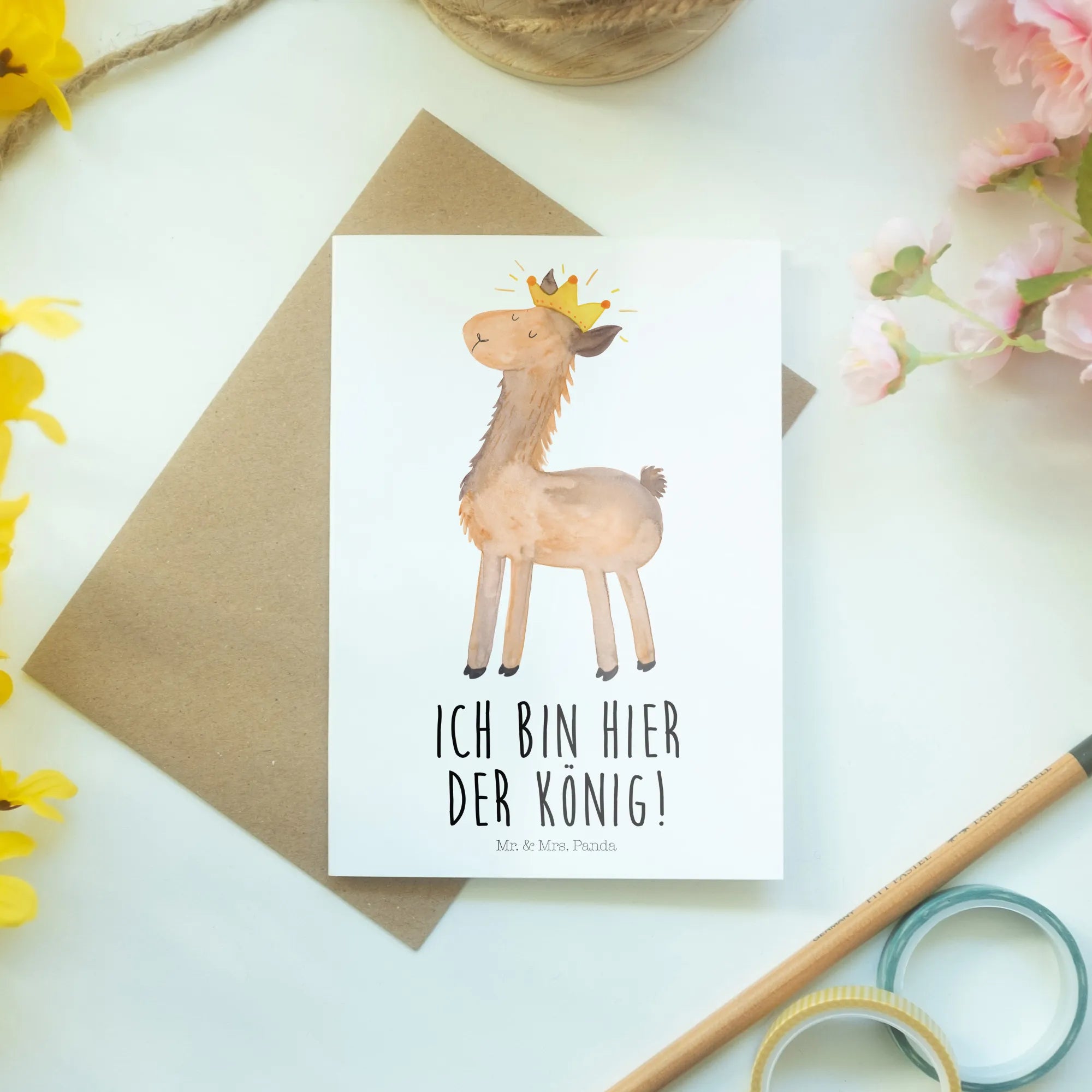 Die perfekte Grußkarte von Mr. & Mrs. Panda! Diese wunderschöne und einzigartige Grußkarte mit dem Motiv "Lama König" bringt Freude in jeden Anlass. Egal, ob du Glückwünsche zur Hochzeit, zum Geburtstag oder einfach einen lieben Gruß senden möchtest – diese Karte ist das ideale Geschenk für Freunde, Familie oder deine Büro-Kollegen.