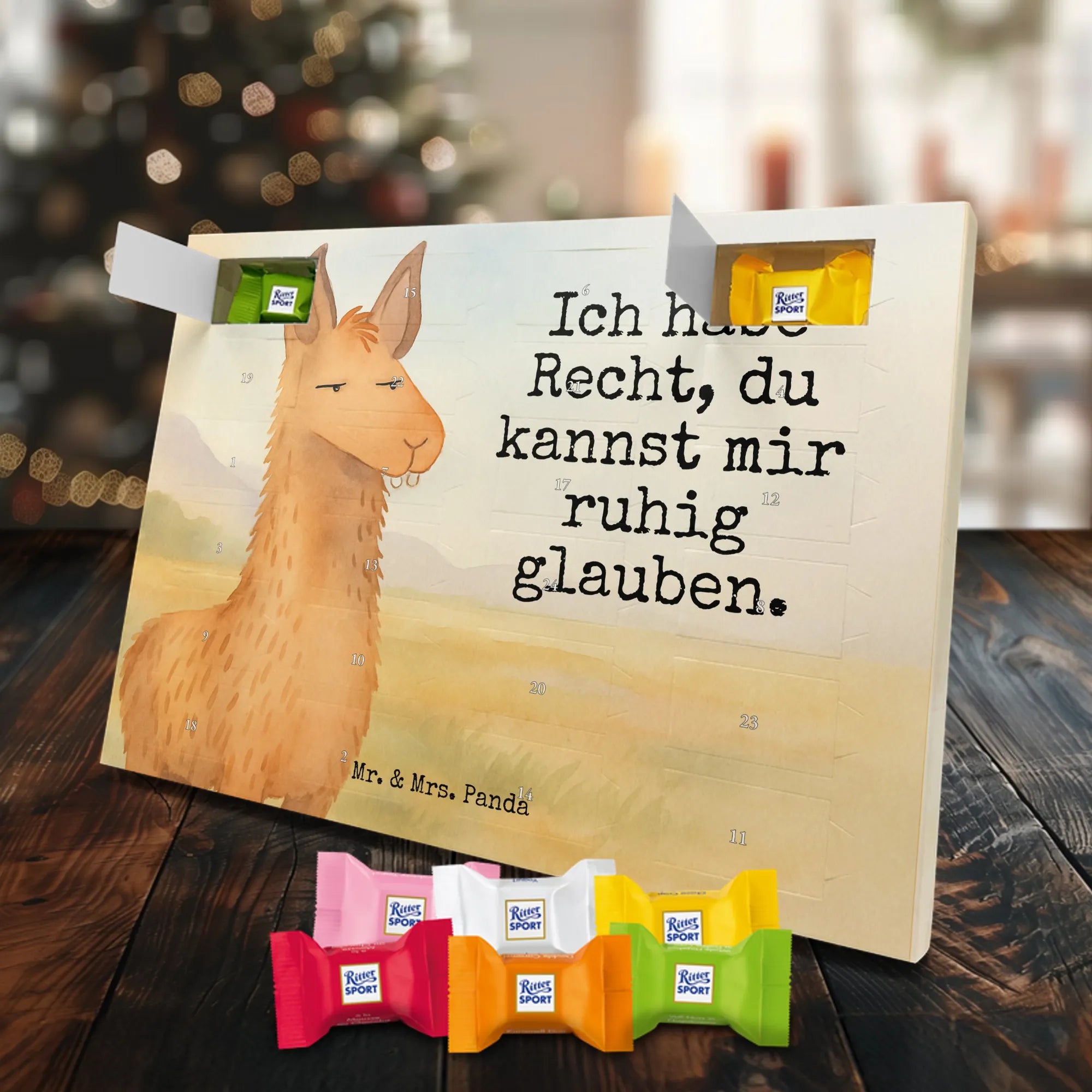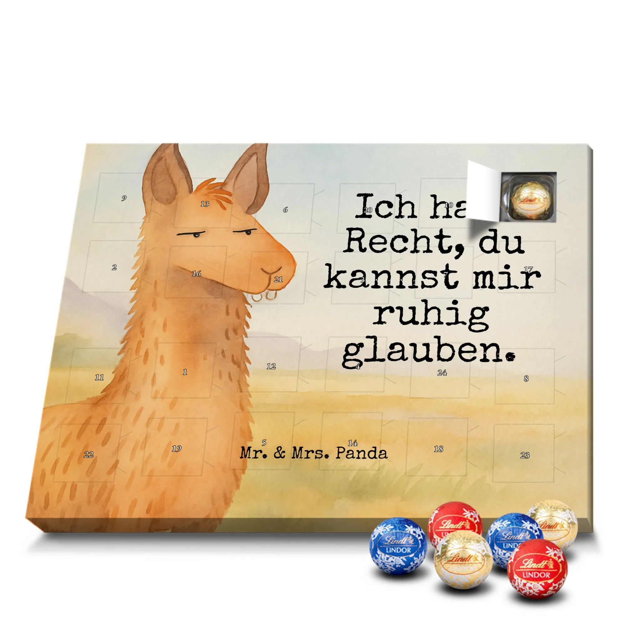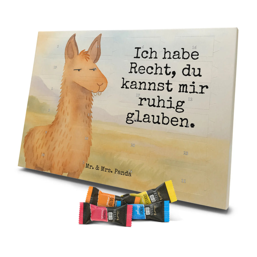 Mr. & Mrs. Panda Schoko Adventskalender „Lamakopf genervt“ – der ideale Adventskalender für Lama-Fans und Schokoladenliebhaber. Das handgezeichnete Lama-Motiv mit dem frechen Spruch „Ich habe Recht, du kannst mir ruhig glauben.“ bringt Humor und Stil in die Vorweihnachtszeit und ist ein tolles Geschenk für Freundin, beste Freundin, Partnerin, Chefin, Chef, Azubi oder Kollegen im Büro.