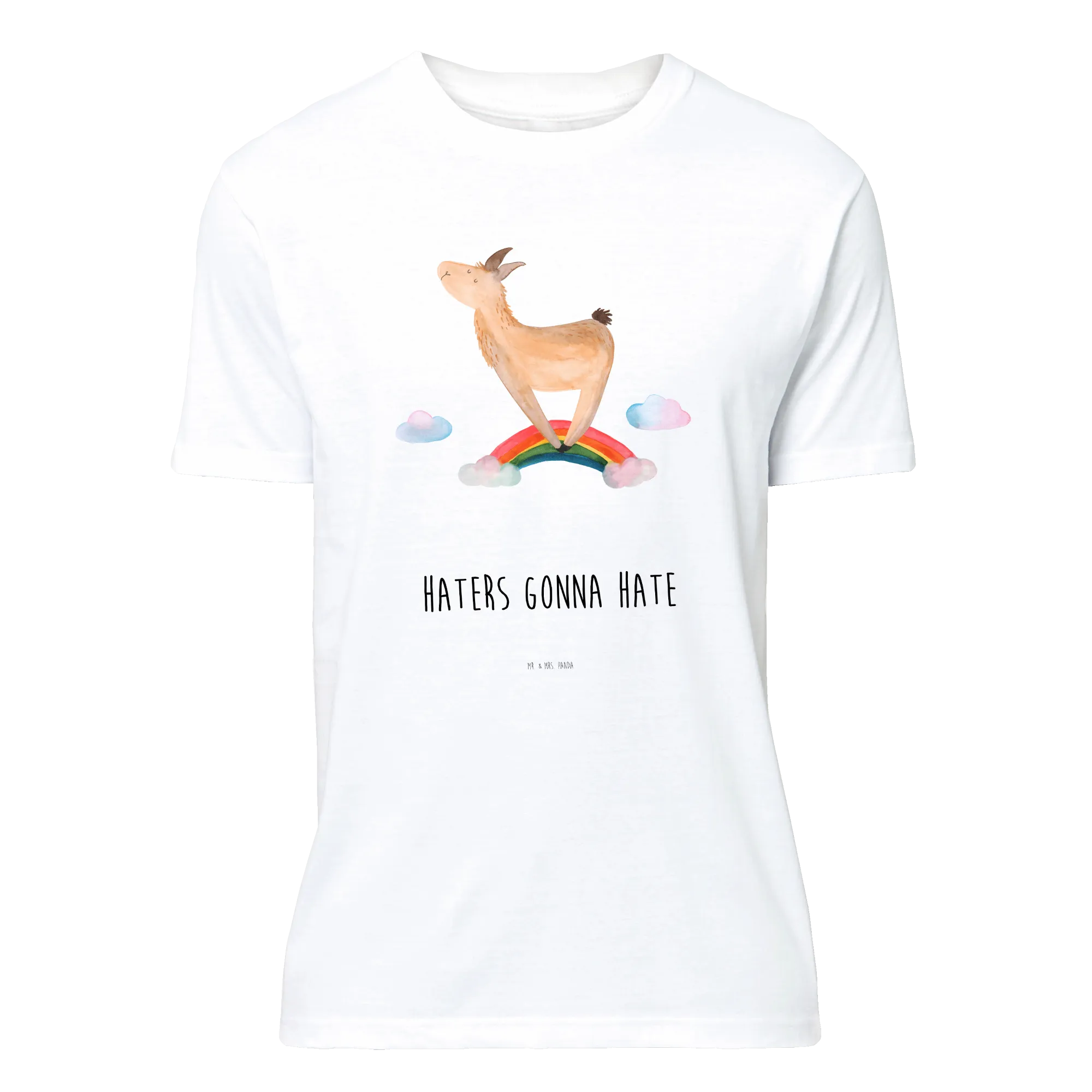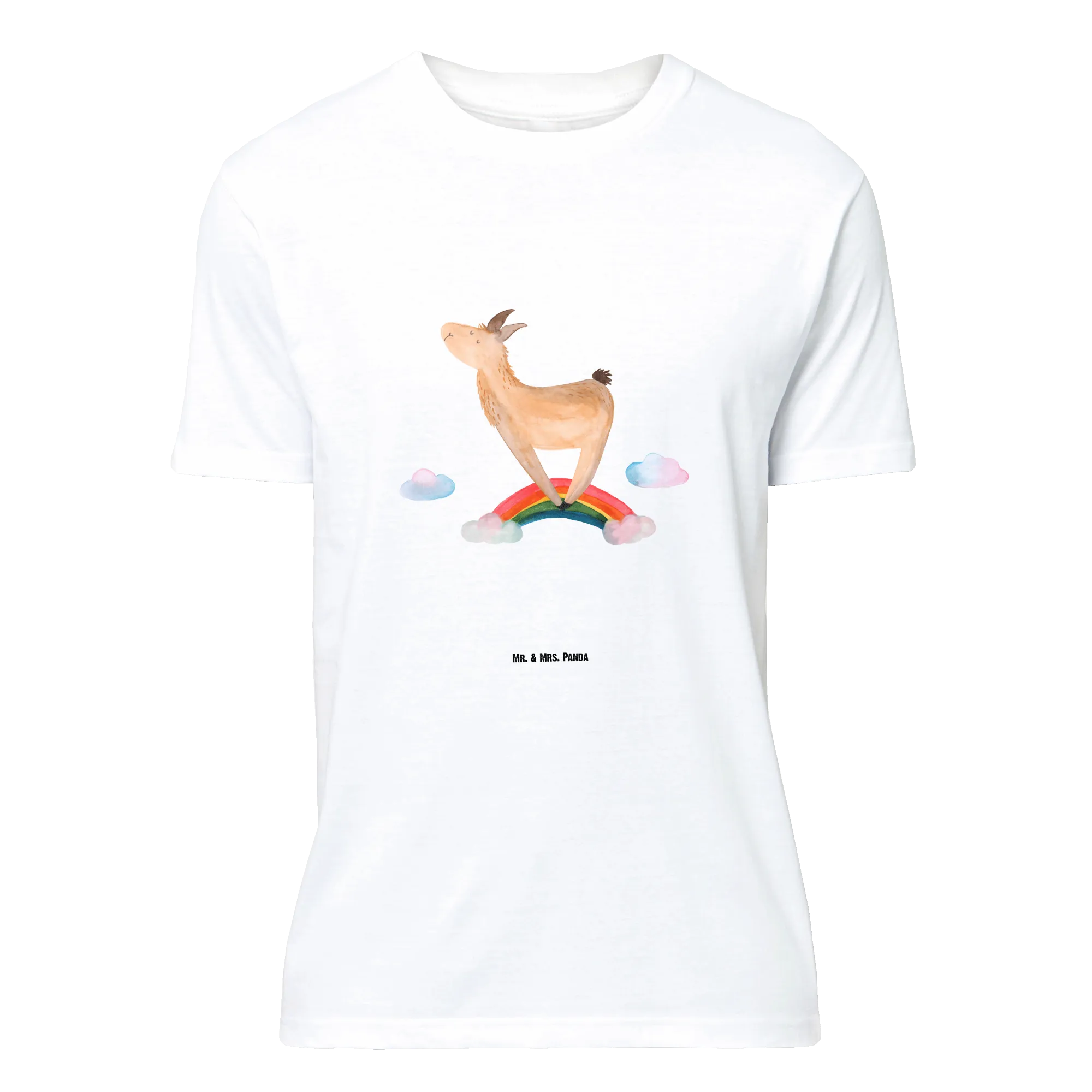 Suchst du ein T-Shirt, das Freude macht? Unser Größe L T-Shirt mit dem zauberhaften Lama Regenbogen Motiv aus der Lama - Kollektion von Mr. & Mrs. Panda ist genau das: fröhlich, frech und total liebenswert. Das Motiv zeigt ein süßes Lama, das über einen bunten Regenbogen hüpft – perfekt für alle, die Lamas und bunte Designs lieben.