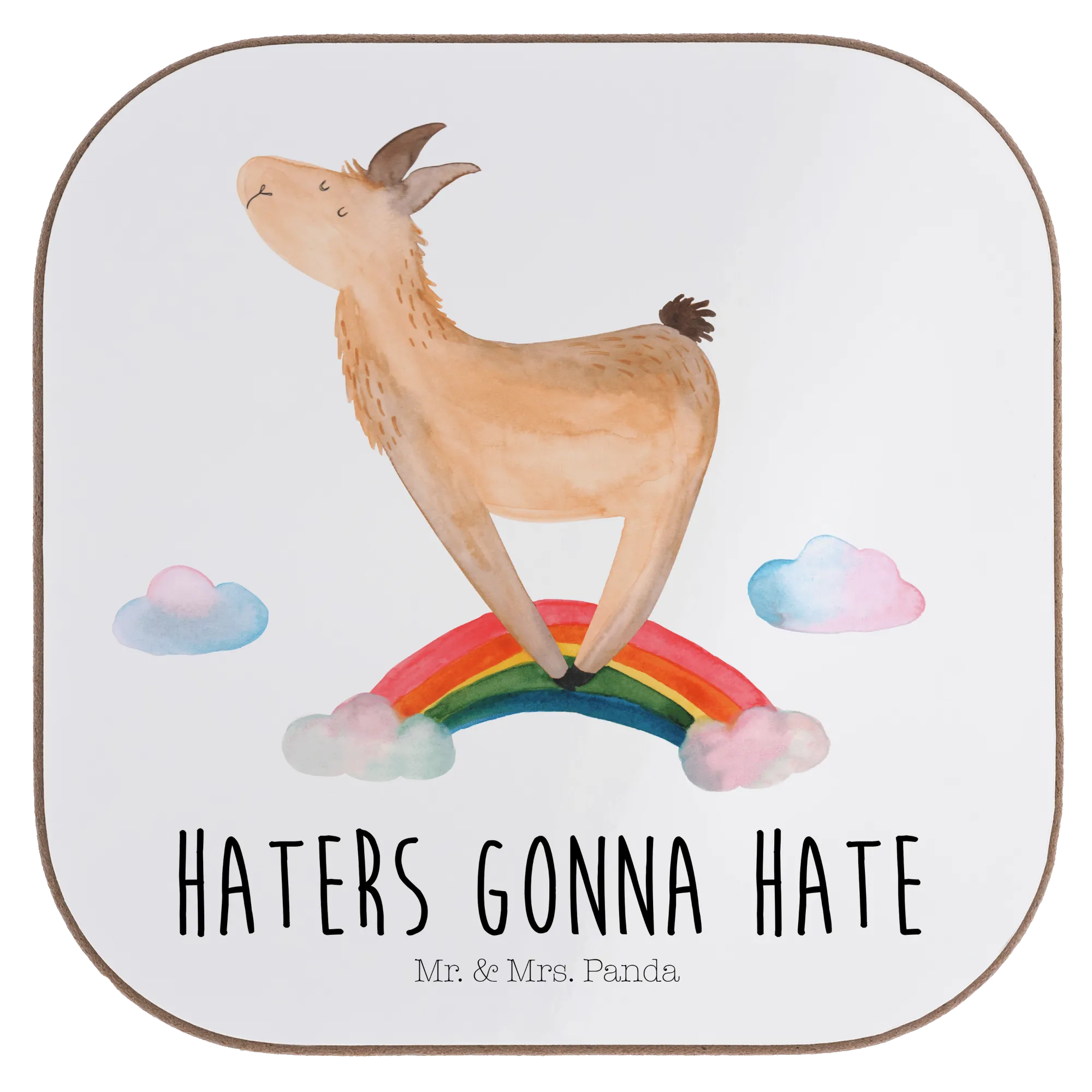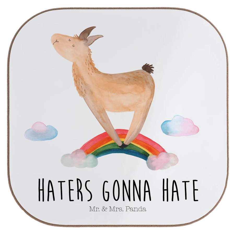 Das bezaubernde Design zeigt ein süßes Lama, das über einen Regenbogen hüpft und mit dem Spruch "Haters gonna hate" deine Gäste zum Schmunzeln bringt. Jedes Motiv wurde mit viel Liebe von Mrs. Panda handgezeichnet und macht diese Untersetzer zu einem einzigartigen Dekorationsstück für dein Zuhause oder dein Büro. Die glänzende und hochwertige Oberfläche sorgt dafür, dass der Untersetzer immer toll aussieht und einfach mit einem feuchten Tuch gereinigt werden kann.