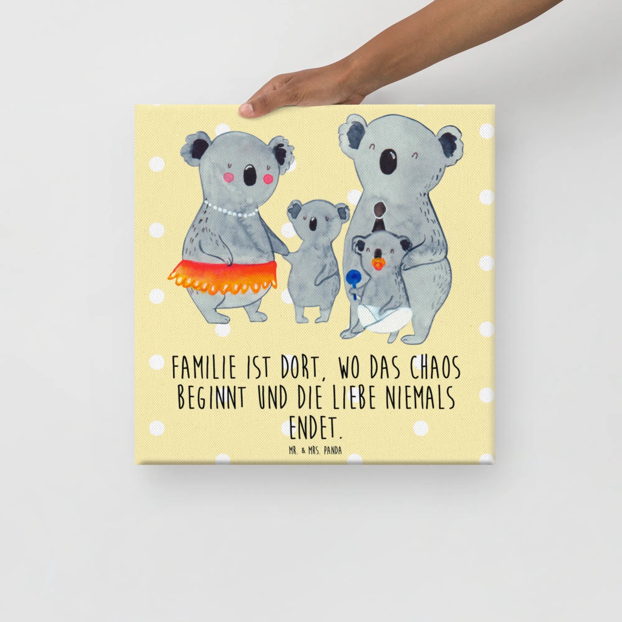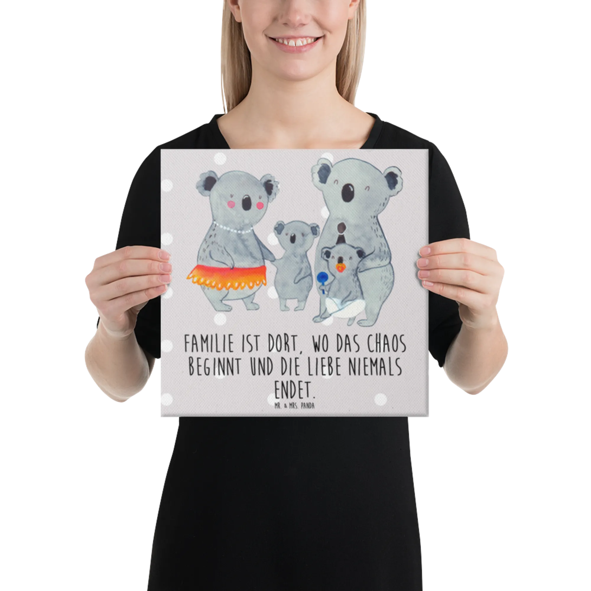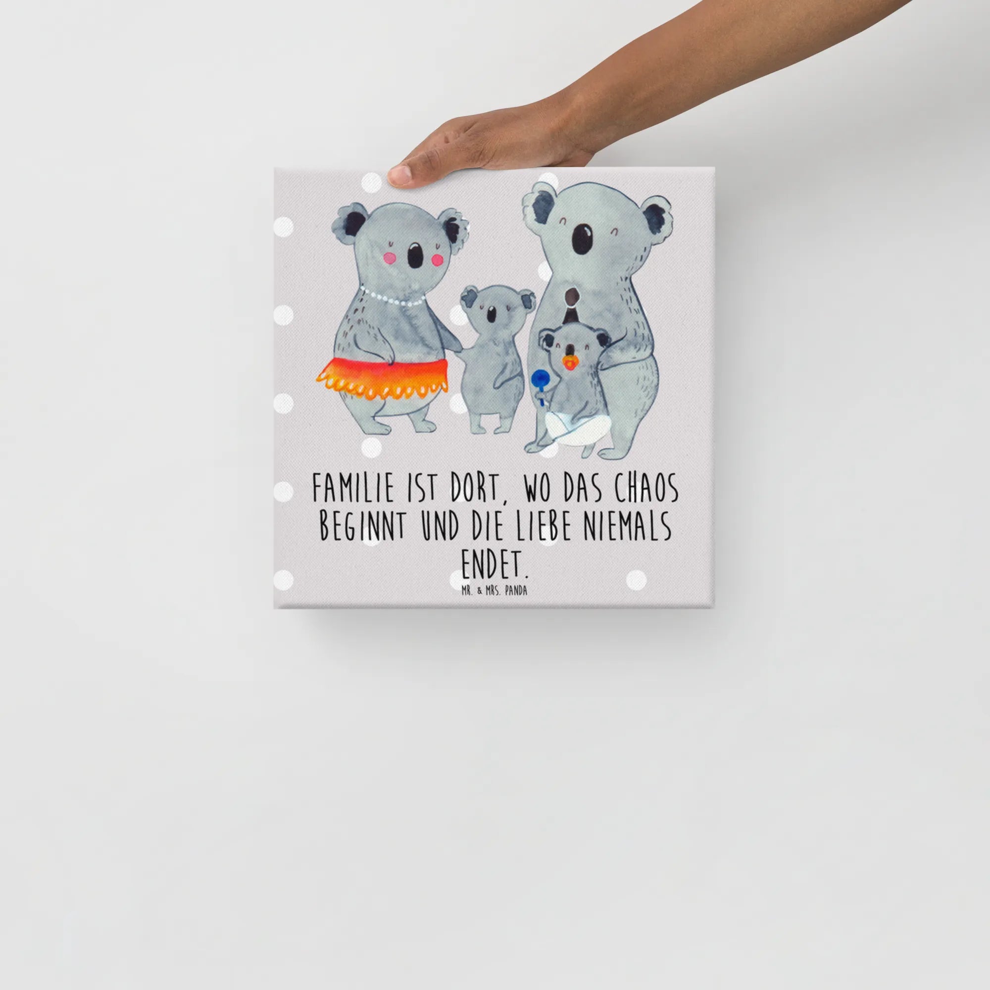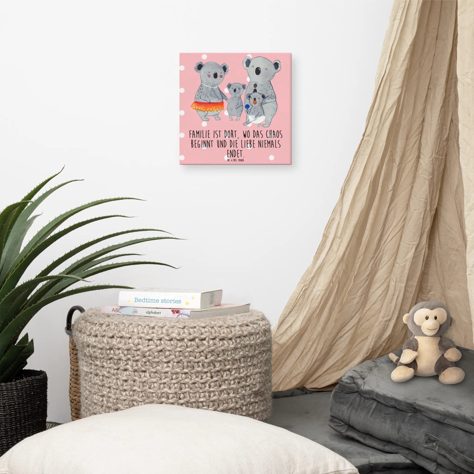Dieses liebevoll illustrierte Leinwand Bild aus der Familien-Kollektion von Mr. & Mrs. Panda bringt Wärme und Geborgenheit an jede Wand. Die Koala Familie zeigt zwei größere und zwei kleinere Koalas mit menschlichen Accessoires: Perlenkette, Partyhut, Lätzchen und Spielzeug. Ihre lächelnden Gesichter und geschlossenen Augen strahlen Freude und Zuneigung aus. Auf der quadratischen Leinwand prangt der schöne Spruch: „Familie ist dort, wo das Chaos beginnt und die Liebe niemals endet.“