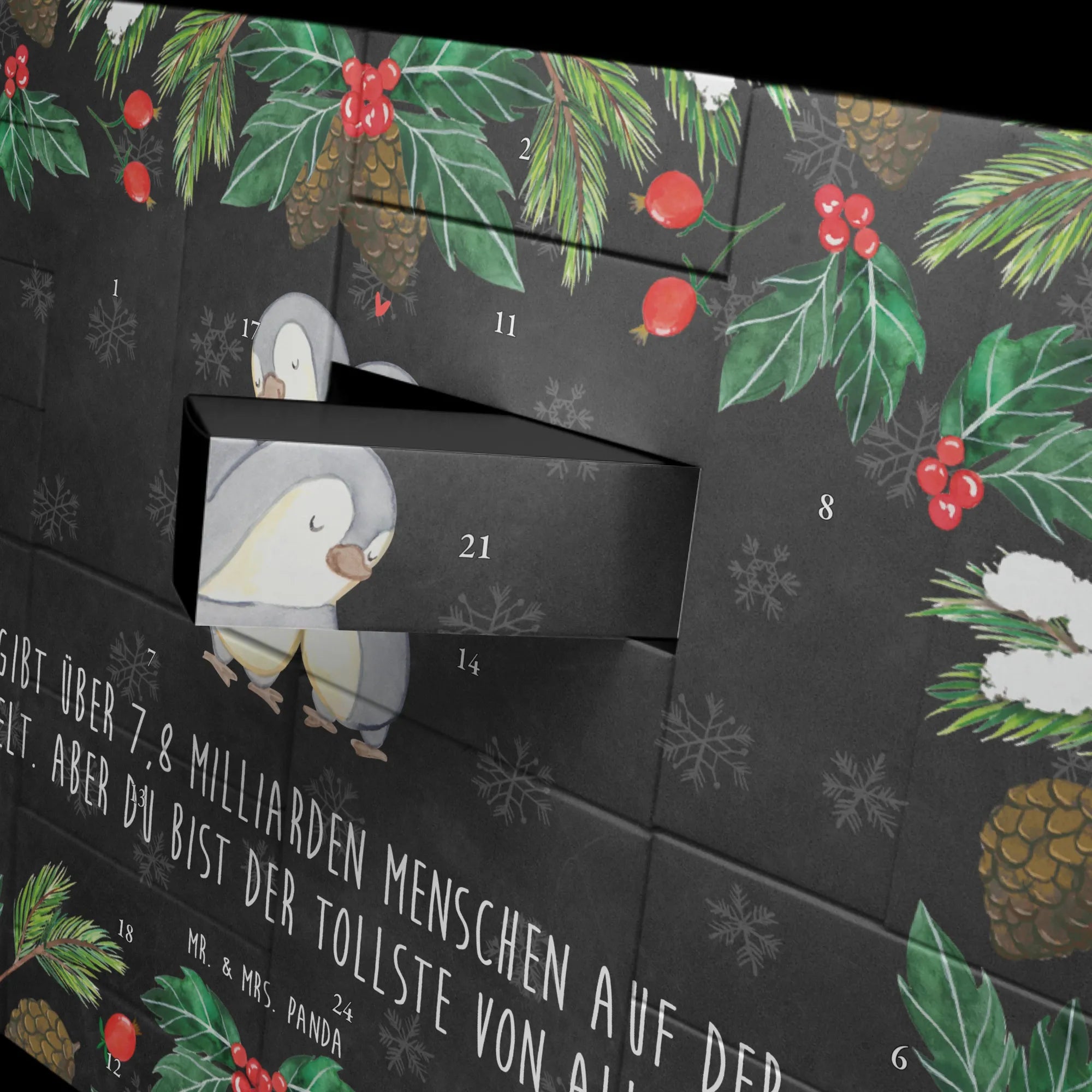 Der befüllbare Adventskalender „Pinguine Kuscheln“ von Mr. & Mrs. Panda ist das perfekte Geschenk, um in der Vorweihnachtszeit liebevolle Momente zu teilen. In jeder der 24 Schachteln kannst du kleine Aufmerksamkeiten oder Süßigkeiten verstecken, die deinem Partner, deiner Freundin oder deinem Ehemann ein Lächeln ins Gesicht zaubern. Die wundervolle Zeichnung von Mrs. Panda zeigt zwei kuschelnde Pinguine, die symbolisch für Zuneigung und Geborgenheit stehen. Durch den aufgedruckten Spruch "Es gibt über 7,8 Milliarden Menschen auf der Welt. Aber du bist der Tollste von allen!" übermittelst du eine besondere Liebesbotschaft, die dein Herz zu jeder Tageszeit erhellt.