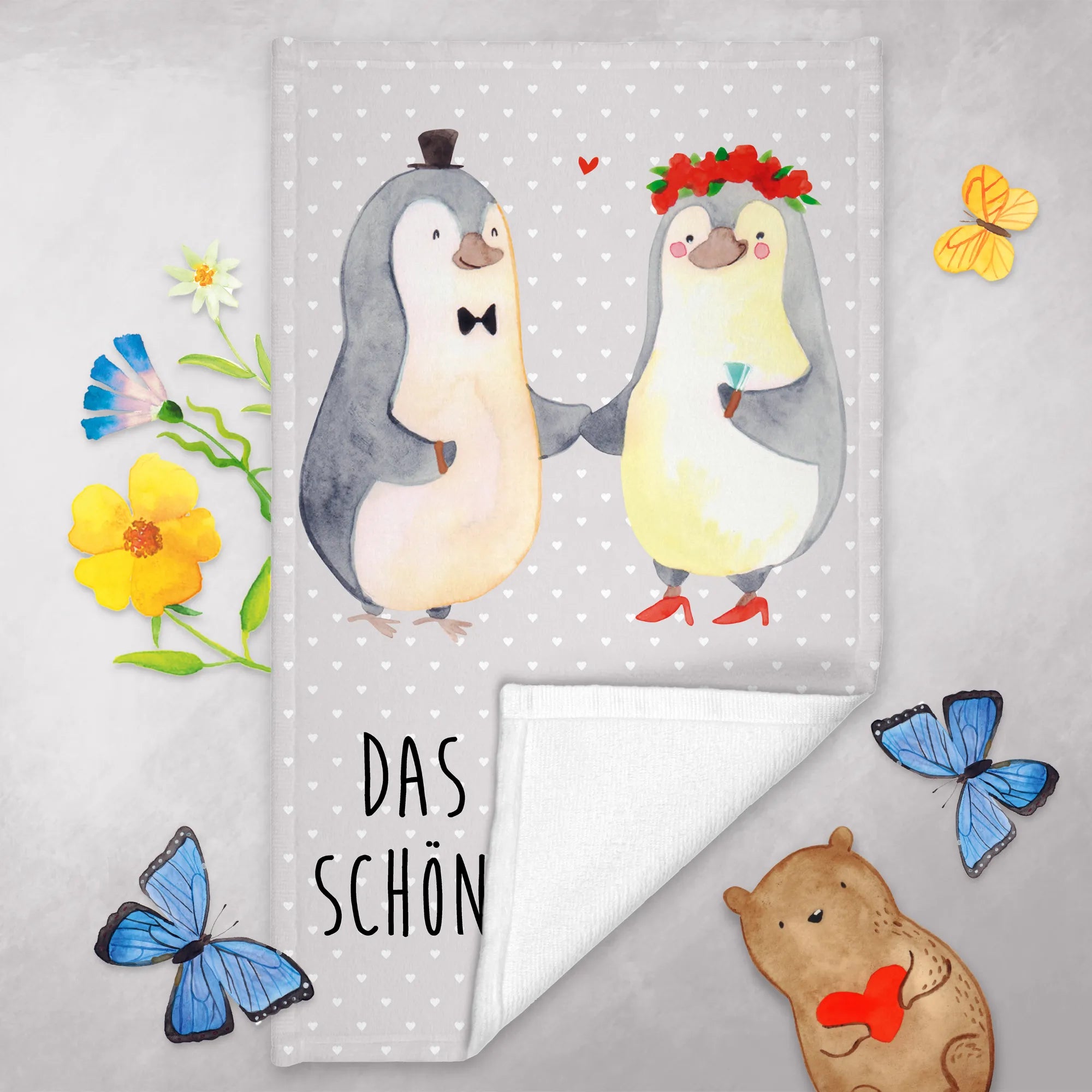 Verwandle dein Badezimmer oder Gäste-WC in einen Ort voller Liebe und Geborgenheit. Das Mr. & Mrs. Panda Gästehandtuch mit dem Motiv Pinguin Heirat ist nicht nur ein praktischer Alltagshelfer, sondern ein echtes Statement für die Zweisamkeit. Das liebevoll gestaltete Motiv zeigt ein Pinguin-Pärchen am schönsten Tag ihres Lebens, ergänzt durch den herzerwärmenden Spruch: "Das Leben ist schön zu zweit!".
