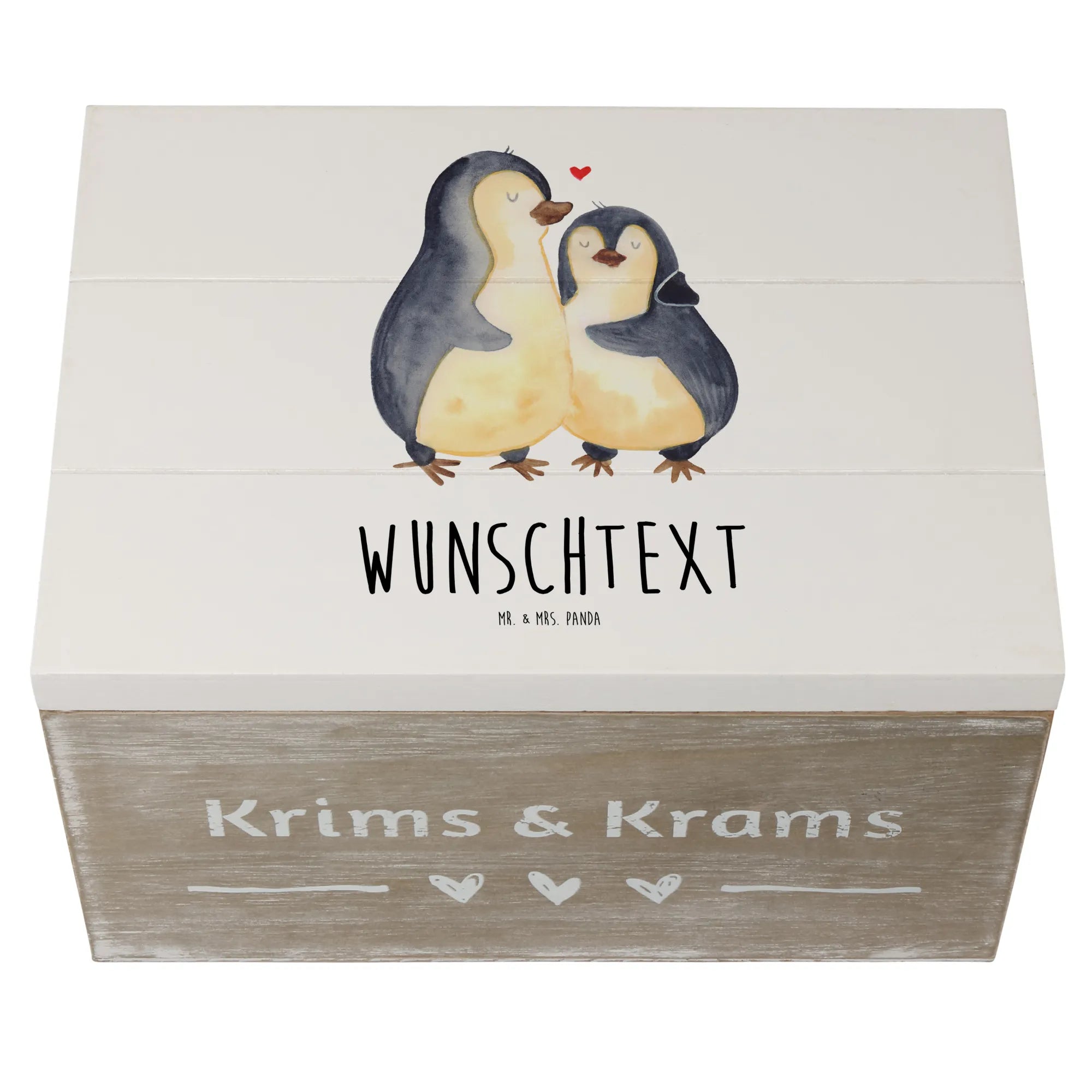 Das liebevoll handgezeichnete Motiv zeigt zwei Pinguine, die sich sanft umarmen und damit die innige Zuneigung und Liebe symbolisieren. Oberhalb der Pinguine schwebt ein rotes Herz, das das glückliche Paar perfekt ergänzt. Diese Holzkiste ist nicht nur ein praktischer Aufbewahrungsort, sondern auch ein stilvolles Dekorationsstück, das jedes Zimmer aufwertet.