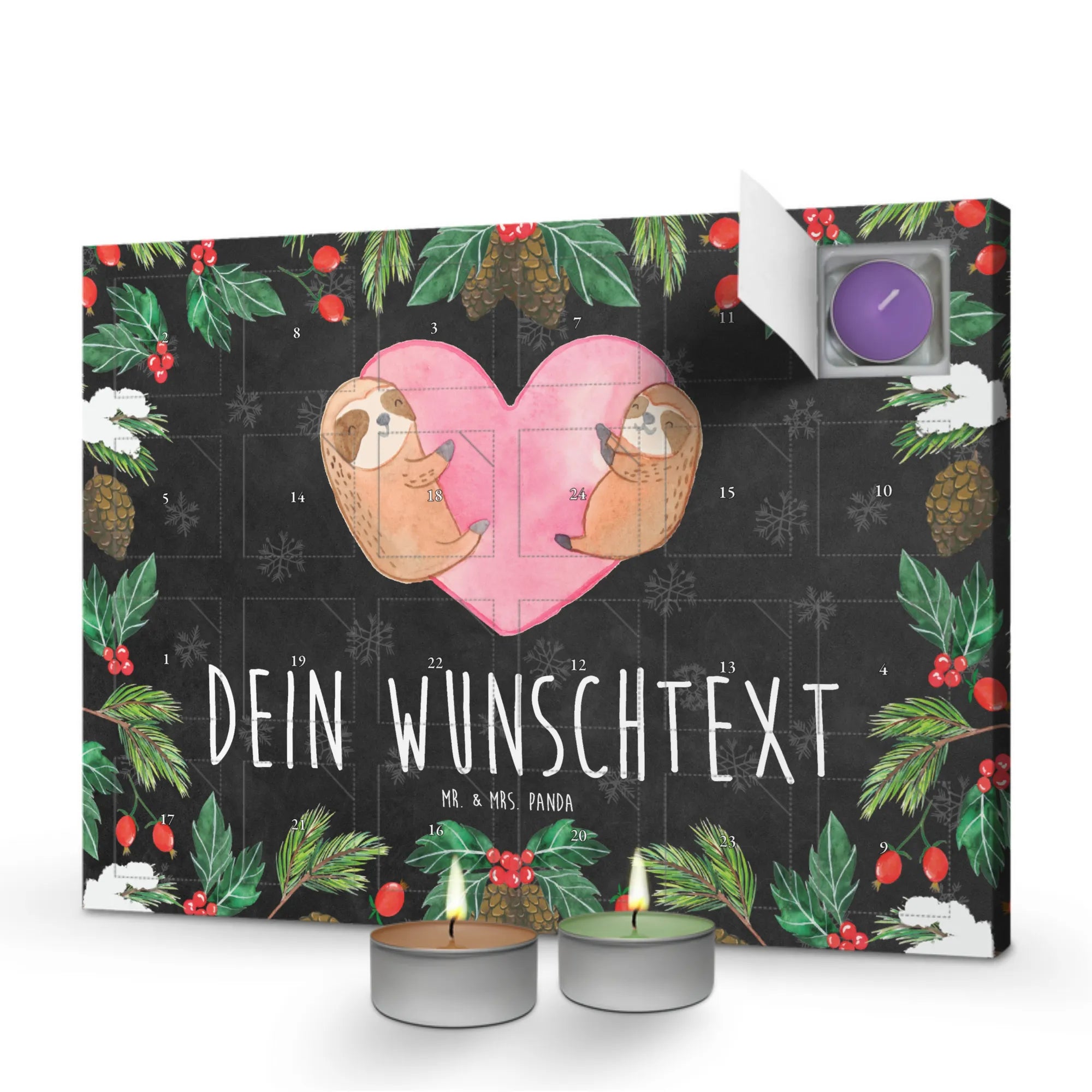 Entdecke den perfekten Adventskalender für die Liebsten: den personalisierten Duftkerzen Adventskalender Faultiere Herz von Mr. & Mrs. Panda. 🎄 Dieser liebevoll gestaltete Adventskalender bringt nicht nur festliche Vorfreude, sondern auch die warmen, gemütlichen Düfte in dein Zuhause.