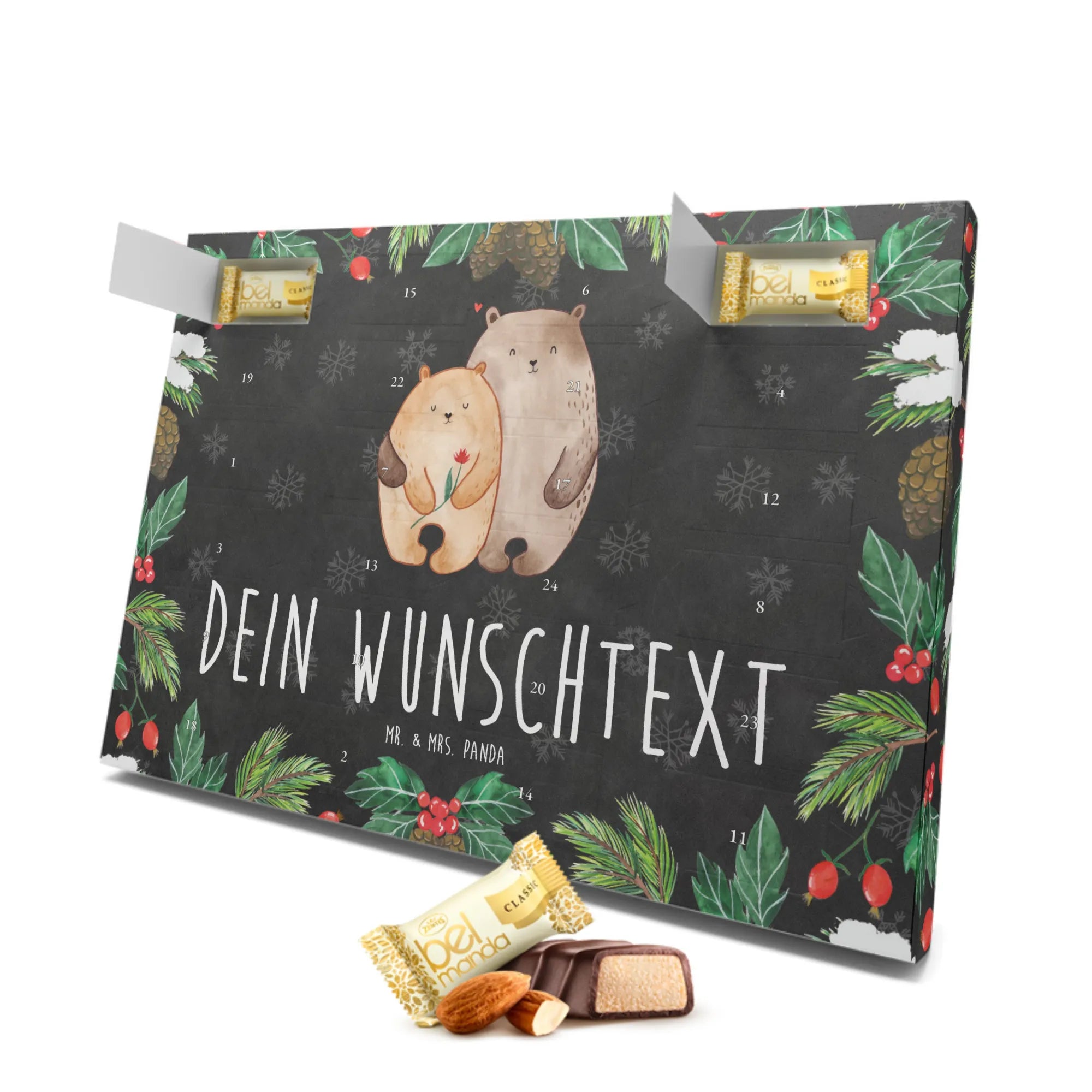 Der personalisierte Marzipan Adventskalender mit dem süßen Motiv 'Bären Liebe' von Mr. & Mrs. Panda ist das perfekte Geschenk für Verliebte. Er bringt Freude und Schokolade in die vorweihnachtliche Zeit und lässt Herzen höher schlagen.