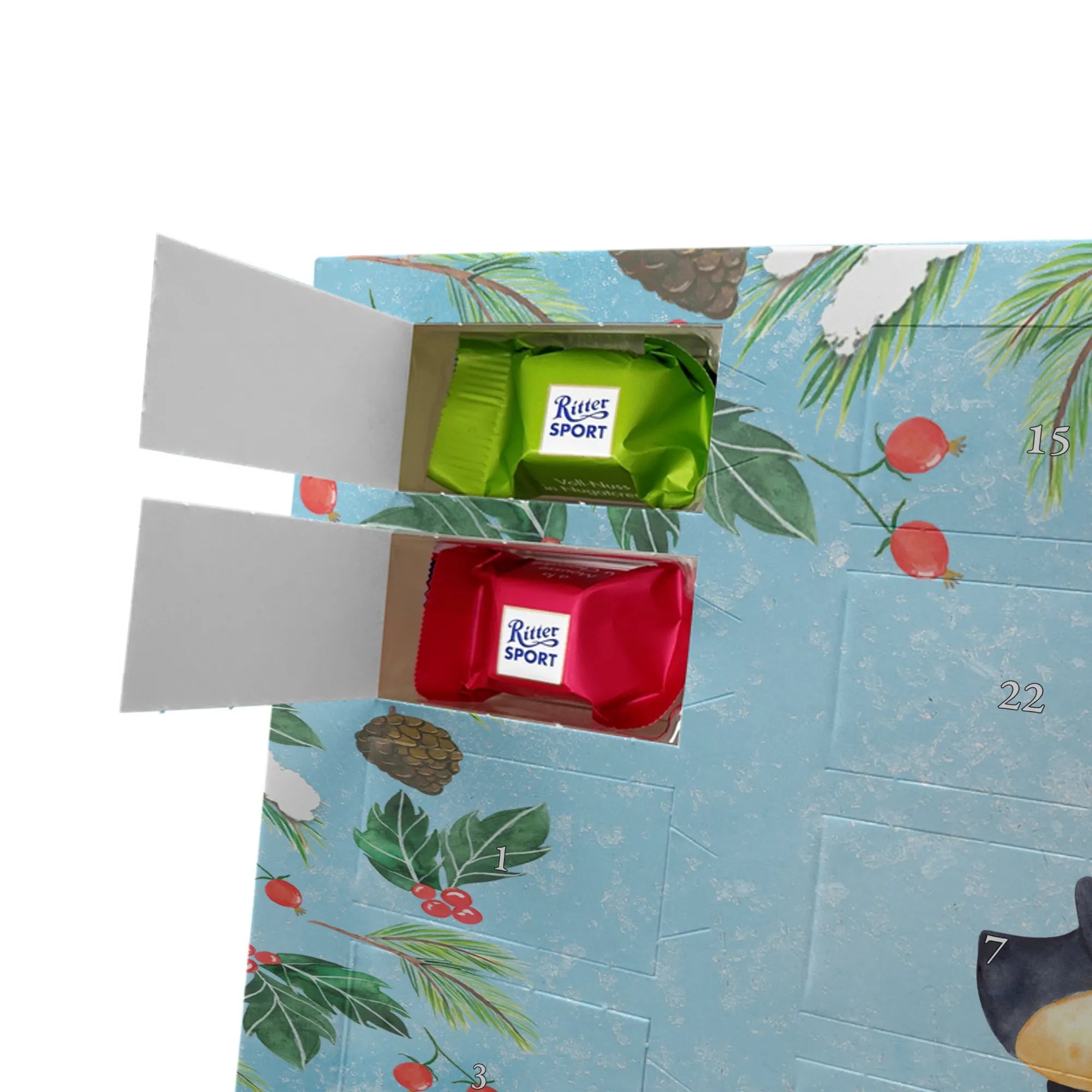 Suchst du einen besonderen Adventskalender, der persönlich und hochwertig ist? Unser Adventskalender mit Namen von Mr. & Mrs. Panda ist genau das – individualisierbar mit dem Namen deiner Liebsten oder einem kurzen Spruch und bedruckt mit unseren beliebten, charmanten Motiven. Die Druckqualität ist brillant, die seidenmatte Oberflächenveredelung verleiht dem Kalender eine elegante Haptik. Auch die Seitenflächen sind liebevoll bedruckt, sodass das Design rundum überzeugt. Du kannst den Kalender aufstellen oder an einer Stelle aufhängen, die du magst – die besondere Form macht beides möglich. Gefüllt ist der Kalender mit Ritter Sport Schokowürfeln in sechs beliebten Sorten: Mousse au Chocolat, Schoko Crisp, Voll-Nuss in Nougatcreme, Karamell Duo, Joghurt und Erdbeer-Joghurt. So gibt es hinter jedem Türchen eine kleine, leckere Überraschung. Maße: 325 mm x 225 mm x 27 mm – kompakt genug, um überall Platz zu finden, groß genug für 24 sorgfältig verpackte Schokowürfel.