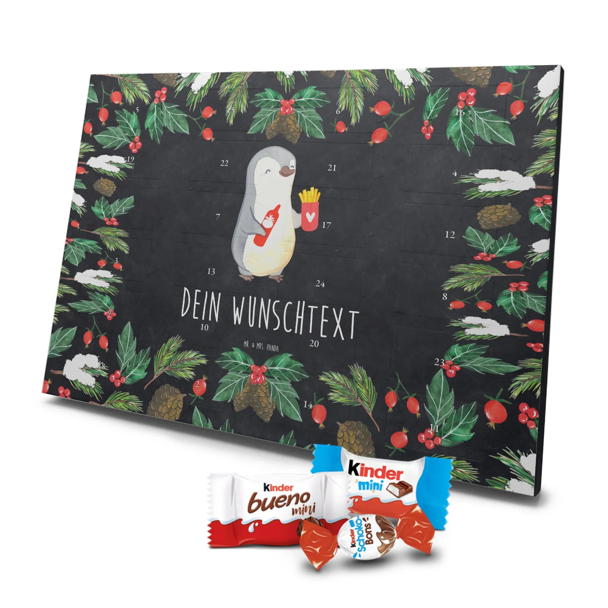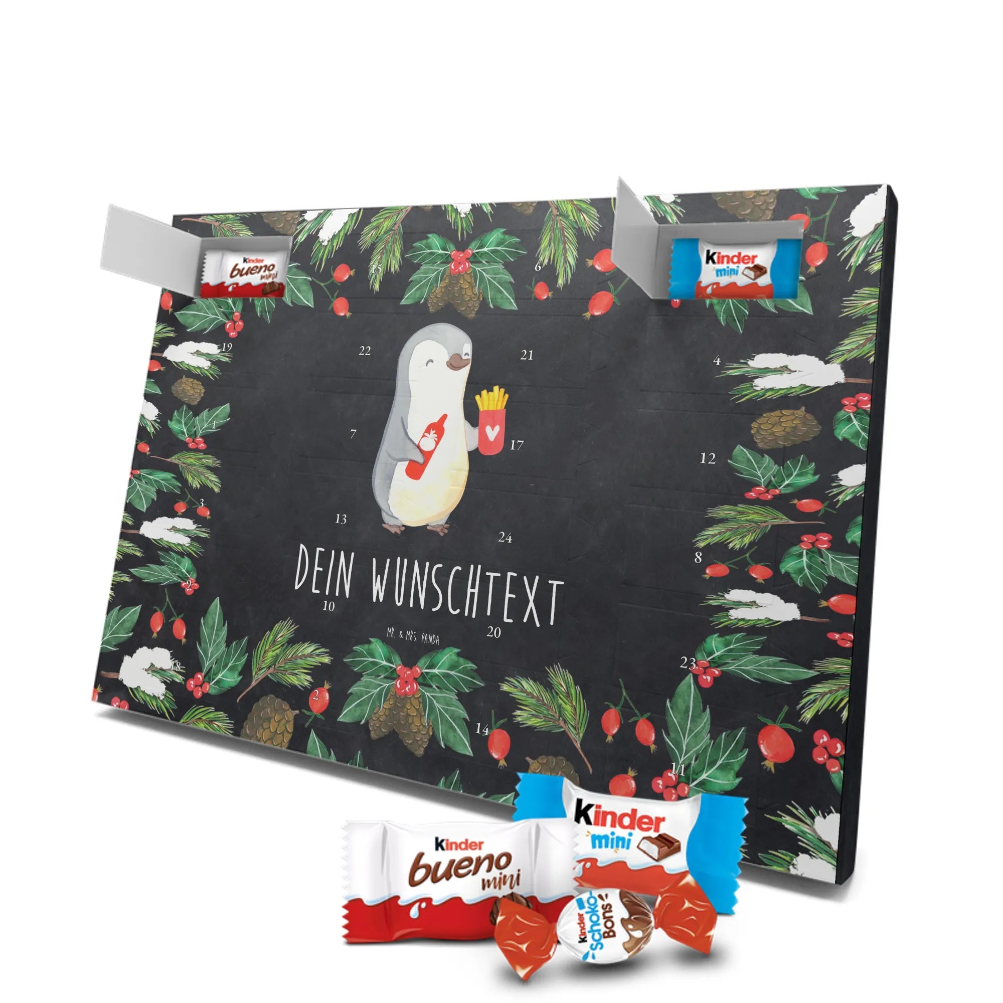 Wunderschöner Personalisierter Schoko Adventskalender von Mr. & Mrs. Panda – perfekt, um die Vorweihnachtszeit besonders persönlich zu gestalten. Unser liebevoll gestalteter Adventskalender ist bedruckt mit wunderschönen Motiven & Sprüchen von Mr. & Mrs. Panda und lässt sich mit deinem Wunschnamen oder Wunschtext personalisieren. Die brillante Druckqualität mit seidenmatter Oberflächenveredelung sorgt für einen edlen Look, und auch die Seitenflächen sind bedruckt, sodass der Kalender von allen Seiten ein Hingucker ist. Du kannst ihn sowohl aufgehängt als auch aufgestellt verwenden, je nachdem, wie es bei dir am besten passt. Maße: 355 mm x 245 mm x 11 mm – kompakt genug, um überall Platz zu finden, und groß genug für eine schöne Überraschung hinter jedem Türchen. Besonderheit: kann aufgehängt oder aufgestellt werden, ideal für Tisch, Regal oder Wand. Gefüllt mit kinder® Schokolade: Adventskalender gefüllt mit kinder® Schokolade; Inhalt: kinder® Schoko-Bons, kinder® Bueno mini und kinder® Schokolade mini. Ein toller persönlicher Adventsteller für Freunde, Familie oder dich selbst – zaubere jeden Tag ein Lächeln ins Gesicht mit süßen Highlights und einem liebevollen Design von Mr. & Mrs. Panda.