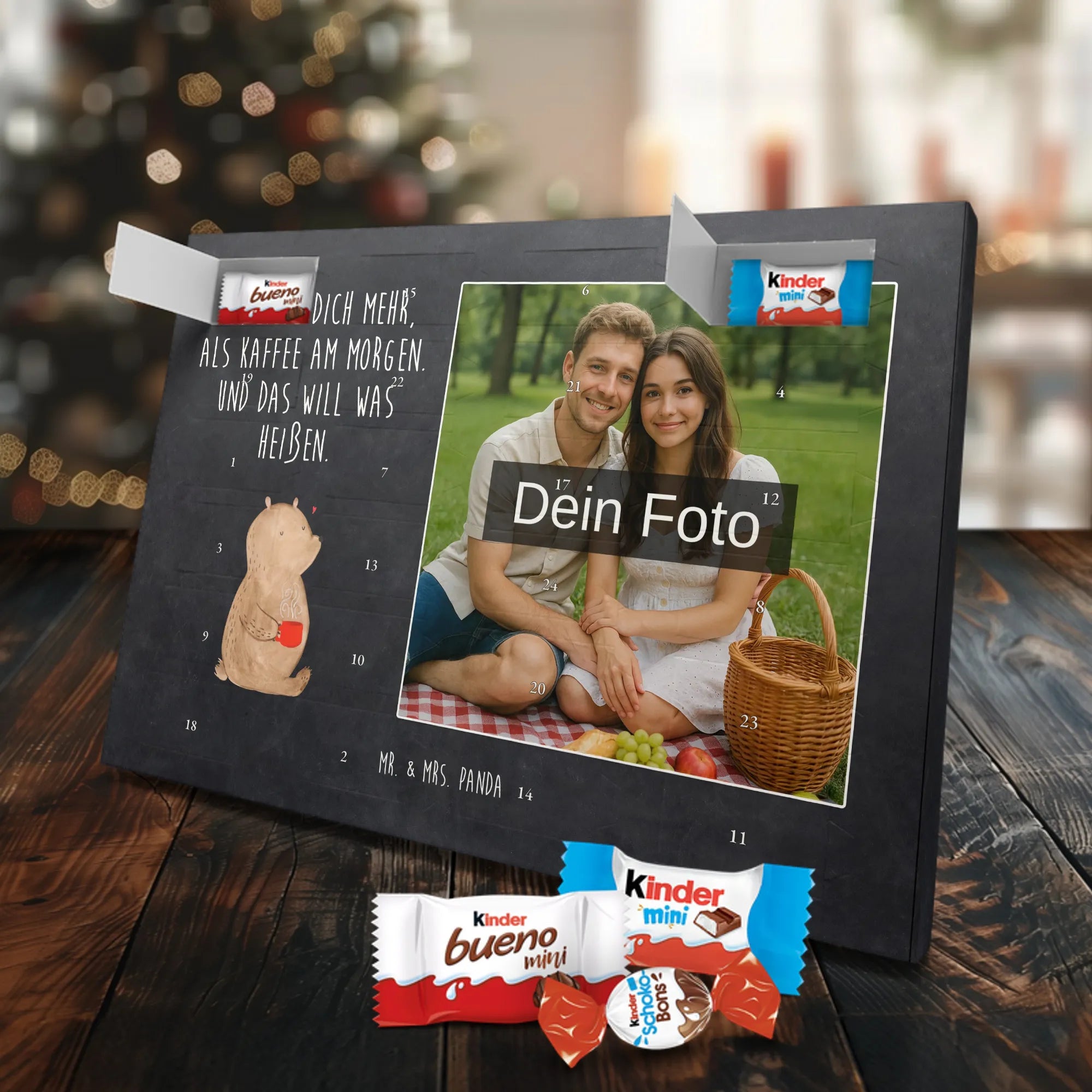 Überrasche deinen Lieblingsmenschen mit einem Adventskalender, der Herzen erwärmt. Unser liebevoll gestalteter Adventskalender aus der Liebe-Kollektion von Mr. & Mrs. Panda verbindet ein niedliches Motiv – den gemütlichen Bären mit seinem roten Becher – mit deinem ganz persönlichen Foto. Der Slogan „Ich liebe dich mehr, als Kaffee am Morgen. Und das will was heißen.“ macht ihn zu einem perfekten Liebesgeschenk für Jahrestag, Valentinstag oder Hochzeitstag. ❤️