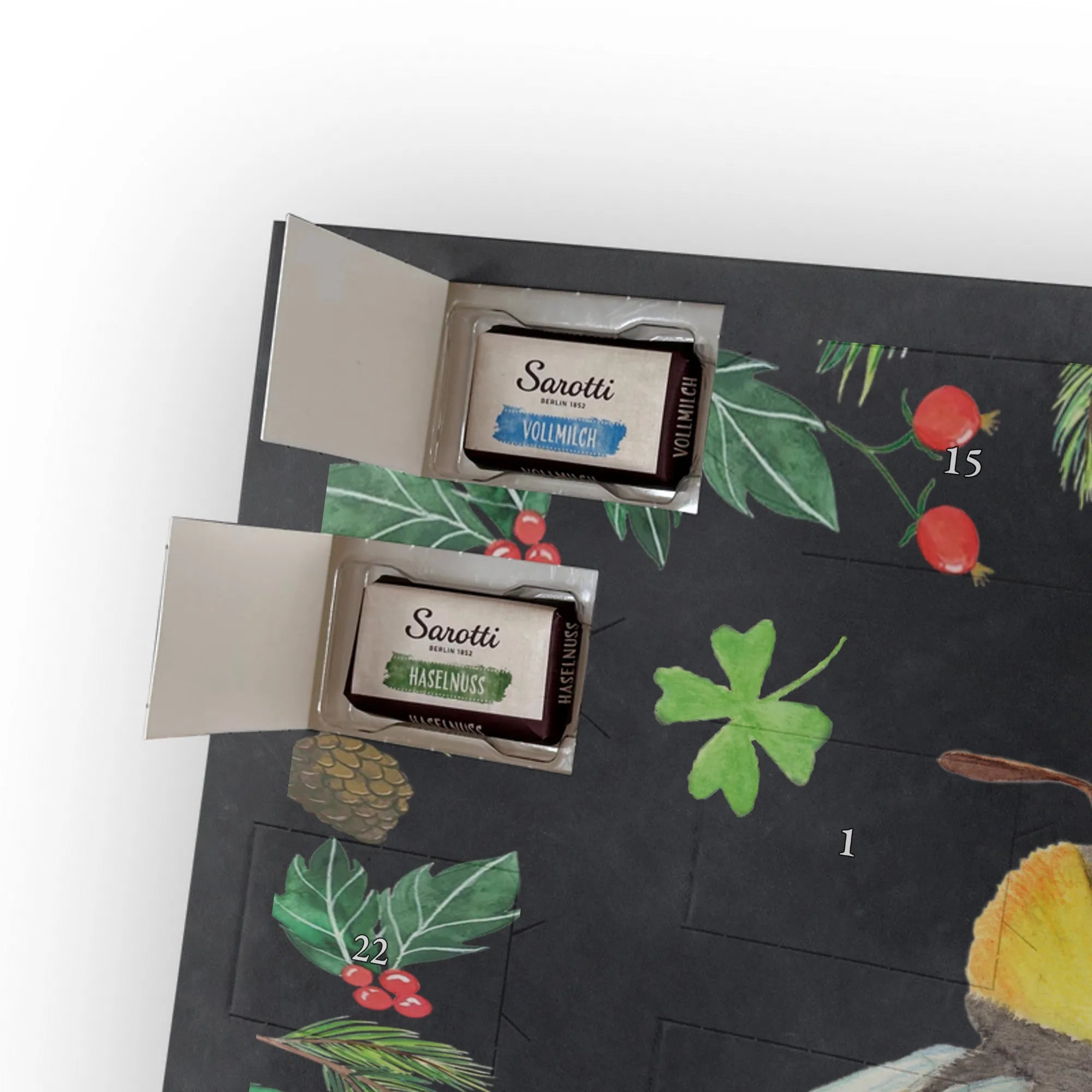 Mach die Vorweihnachtszeit besonders süß mit unserem Schoko-Adventskalender von Mr. & Mrs. Panda. Fröhliche Illustrationen und liebe Sprüche schmücken Vorder- und Seitenflächen, gedruckt in brillanter Qualität und veredelt mit einer seidenmatten Oberfläche für ein warmes, elegantes Finish. Der Kalender ist nicht personalisierbar, überzeugt dafür durch praktische Nutzung: zum Aufhängen oder Aufstellen geeignet. Hinter den 24 Türchen verbergen sich einzeln verpackte Schokoladentäfelchen in vier köstlichen Geschmacksrichtungen – Vollmilch, Nougat, Zartbitter und Haselnuss – von Sarotti® und Confiserie Heidel®. Insgesamt liefert der Kalender 107 g Markenschokolade. Maße: 355 mm x 245 mm x 11 mm – ideal, um Adventsfreude dekorativ zu präsentieren. Verschenke Liebe und Genuss in einem schönen Design, das sich wunderbar in jede Weihnachtsecke einfügt. Mr. & Mrs. Panda wünscht dir eine gemütliche Adventszeit voller kleiner, süßer Überraschungen.