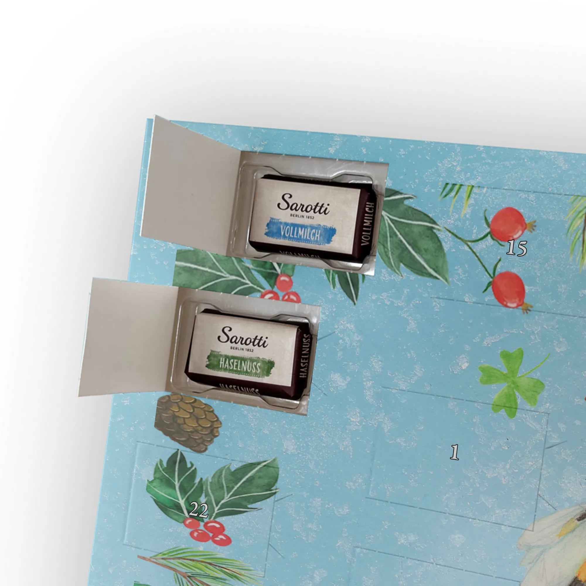 Köstliche Füllung: Gefüllt mit 24 einzeln verpackten Schokoladentäfelchen der Markenschokolade von Sarotti® und Confiserie Heidel®, in vier Geschmacksrichtungen: Vollmilch, Nougat, Zartbitter und Haselnuss. Süße Vorfreude garantiert! 🍫