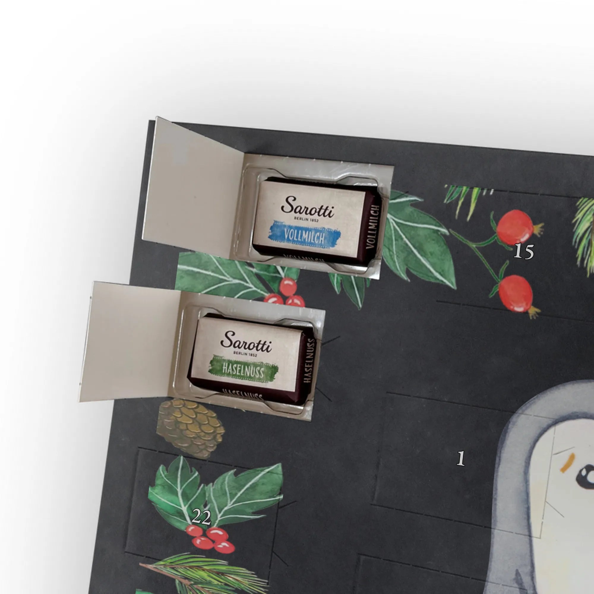 Mach die Vorweihnachtszeit besonders süß mit unserem Schoko-Adventskalender von Mr. & Mrs. Panda. Fröhliche Illustrationen und liebe Sprüche schmücken Vorder- und Seitenflächen, gedruckt in brillanter Qualität und veredelt mit einer seidenmatten Oberfläche für ein warmes, elegantes Finish. Der Kalender ist nicht personalisierbar, überzeugt dafür durch praktische Nutzung: zum Aufhängen oder Aufstellen geeignet. Hinter den 24 Türchen verbergen sich einzeln verpackte Schokoladentäfelchen in vier köstlichen Geschmacksrichtungen – Vollmilch, Nougat, Zartbitter und Haselnuss – von Sarotti® und Confiserie Heidel®. Insgesamt liefert der Kalender 107 g Markenschokolade. Maße: 355 mm x 245 mm x 11 mm – ideal, um Adventsfreude dekorativ zu präsentieren. Verschenke Liebe und Genuss in einem schönen Design, das sich wunderbar in jede Weihnachtsecke einfügt. Mr. & Mrs. Panda wünscht dir eine gemütliche Adventszeit voller kleiner, süßer Überraschungen.