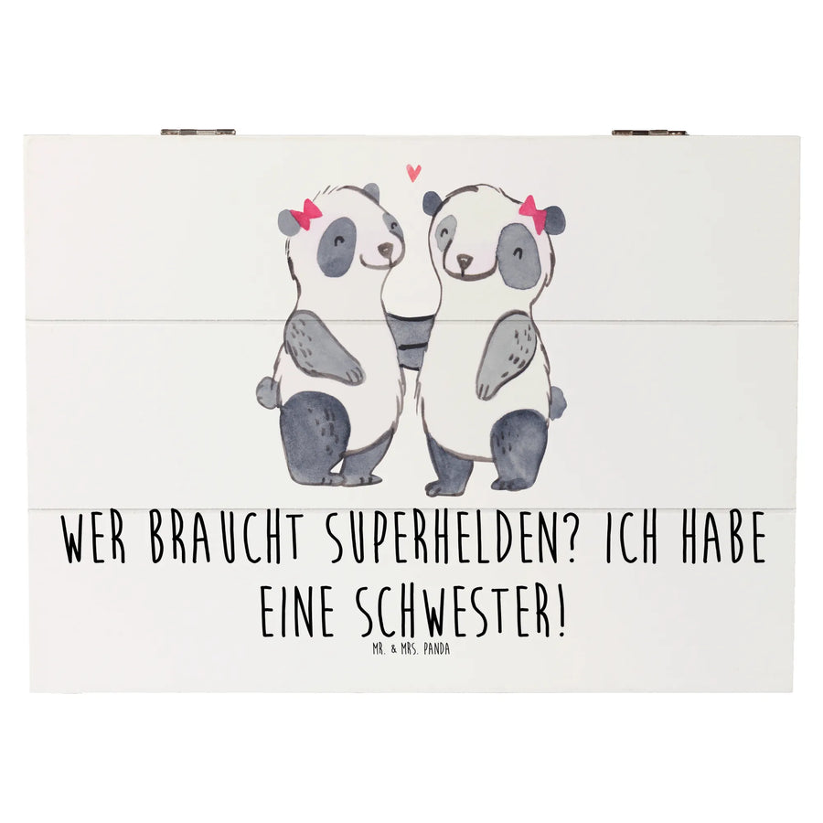 Die Holzkiste von Mr. & Mrs. Panda ist das perfekte Geschenk für Schwestern und die allerschönsten Erinnerungen! Diese wunderschöne Holzkiste ist mehr als nur eine Aufbewahrungsbox – sie ist ein Ort, an dem all die wertvollen Schätze des Lebens aufbewahrt werden können. Ob für Geburtstage, Jahrestage oder einfach als liebevolle Geste – unsere Erinnerungskiste begeistert jeden. Mit einem liebevollen Motiv, das die besondere Beziehung zwischen Geschwistern feiert, strahlt sie Wärme und Freude aus. Der Slogan „Wer braucht Superhelden? Ich habe eine Schwester!“ bringt die innige Liebe und den besonderen Platz, den eine Schwester im Herzen einnimmt, perfekt zum Ausdruck.