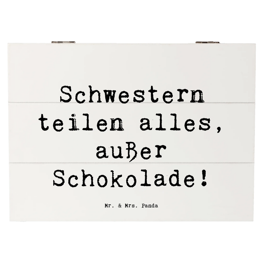 Die Holzkiste von Mr. & Mrs. Panda ist das perfekte Geschenk für Deine Schwester – egal ob für den Geburtstag, den Muttertag oder einfach nur so! Mit ihrem zauberhaften Motiv "Schwestern teilen alles, außer Schokolade!" bringt diese Schatzkiste ein Lächeln auf jedes Gesicht.