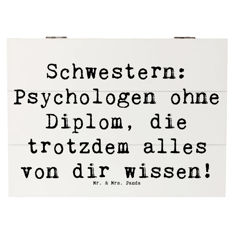 Die Beziehung zu einer Schwester ist einzigartig. Schwestern sind nicht nur Geschwister - sie sind auch beste Freundinnen, Vertraute und oft sogar Seelentröster. Mit dem Spruch „Schwestern: Psychologen ohne Diplom, die trotzdem alles von dir wissen!“ wird diese besondere Verbindung auf wunderbare Weise festgehalten. Egal, ob du die Kiste für Deine ältere Schwester oder Deine kleine Schwester kaufst, sie wird sich über dieses durchdachte Geschenk einfach freuen.