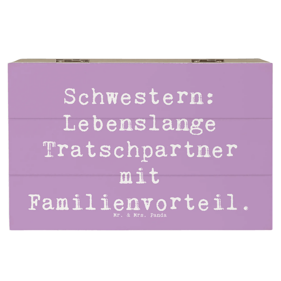 Mit dem liebevoll gestalteten Motiv "Schwester" und dem Slogan "Schwestern: Lebenslange Tratschpartner mit Familienvorteil." zaubert diese Kiste jedem ein Lächeln ins Gesicht. Sie eignet sich perfekt für Geburtstagsgeschenke, Jahrestage oder einfach als Zeichen der Wertschätzung, um Danke zu sagen.