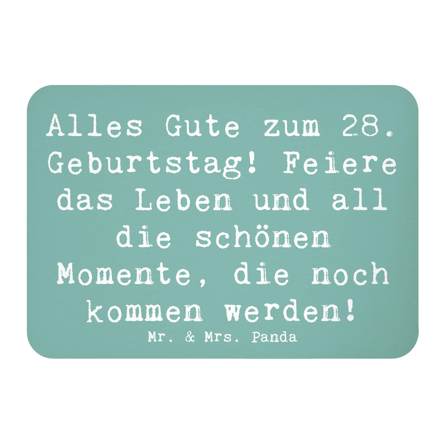 Der Kühlschrankmagnet von Mr. & Mrs. Panda mit dem Motto "Alles Gute zum 28. Geburtstag! Feiere das Leben und all die schönen Momente, die noch kommen werden!" ist das perfekte Geschenk für alle, die ihren 28. Geburtstag feiern. Mit einer Größe von 52 mm x 74 mm und einem Gewicht von nur 20 g ist dieser Magnet leicht und handlich, perfekt um an jedem Kühlschrank, Whiteboard oder Pinnwand zu haften.