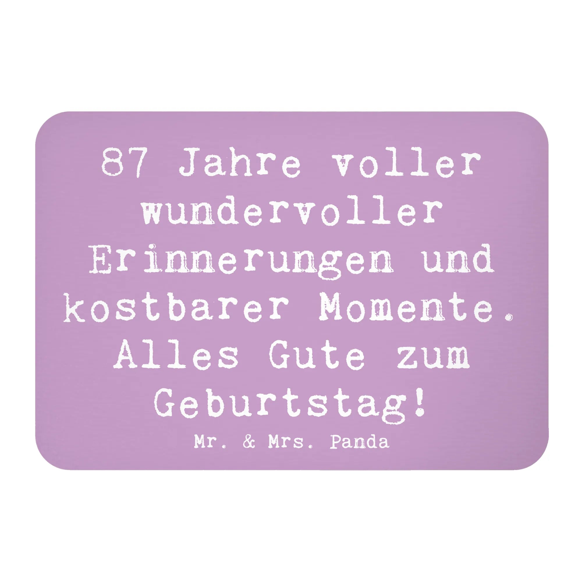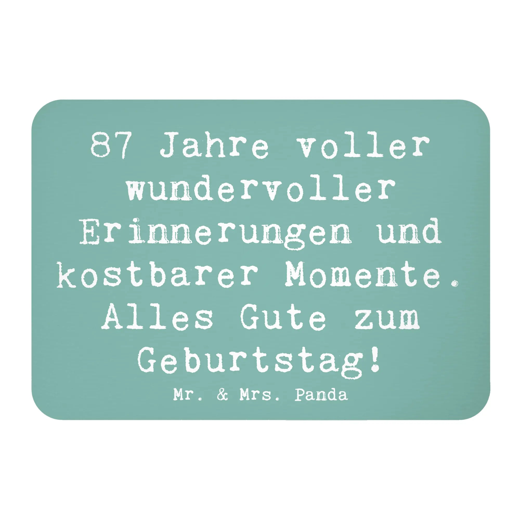Der Kühlschrankmagnet "87 Jahre voller wundervoller Erinnerungen und kostbarer Momente. Alles Gute zum Geburtstag!" von Mr. & Mrs. Panda ist das perfekte Geschenk für einen ganz besonderen Menschen an ihrem 87. Geburtstag. Er ist mehr als nur ein Magnet; er ist eine liebevolle Erinnerung an die vergangenen Jahre und all die kostbaren Momente, die in dieser Zeit erlebt wurden.