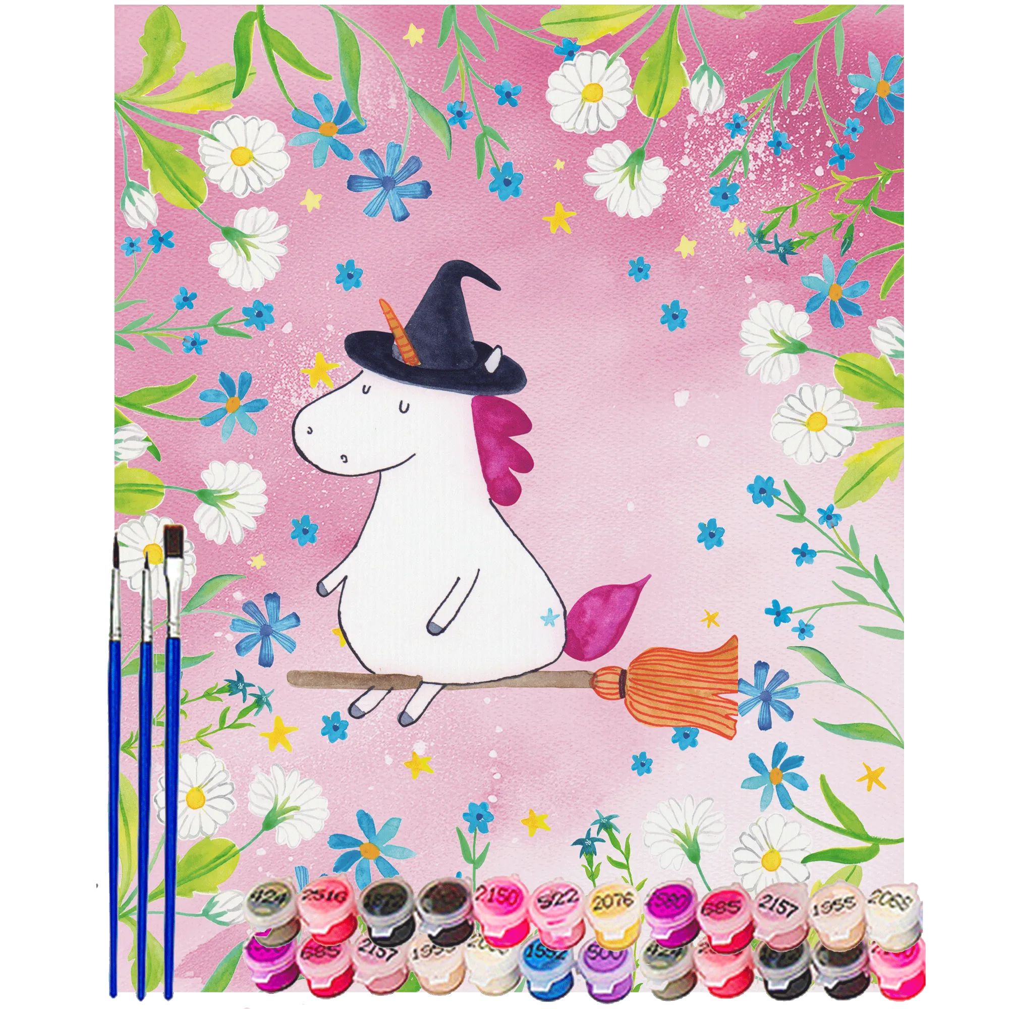 Egal ob du Anfänger oder schon etwas erfahrener im Malen bist, mit 24 traumhaften Acrylfarben kannst du deiner Kreativität freien Lauf lassen und dein persönliches Meisterwerk erschaffen. Das Einhorn Hexe zeigt ein süßes Einhorn, das auf einem Besen reitet und einen Hexenhut trägt – ein hinreißendes Motiv, das deine Gäste zum Schmunzeln bringt!