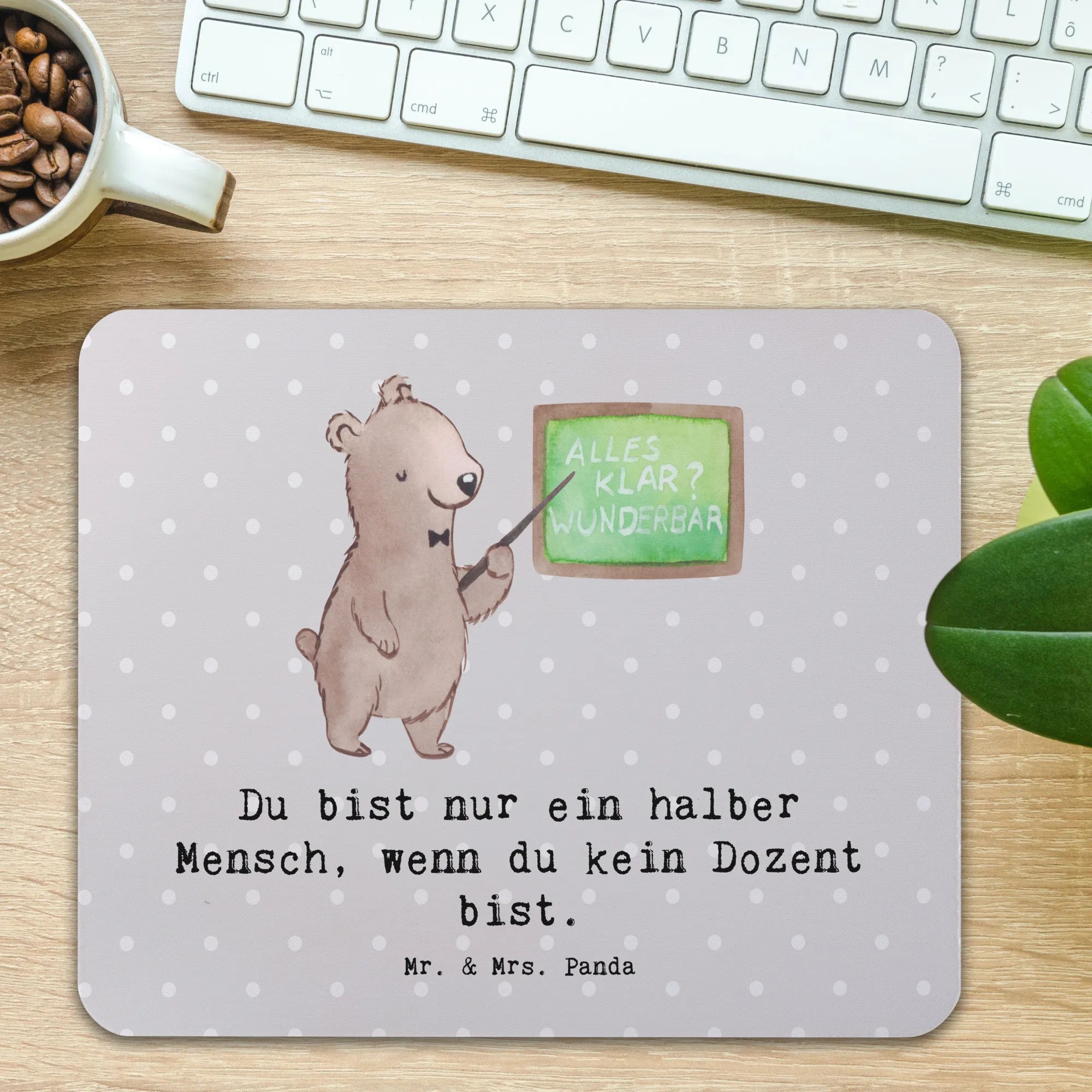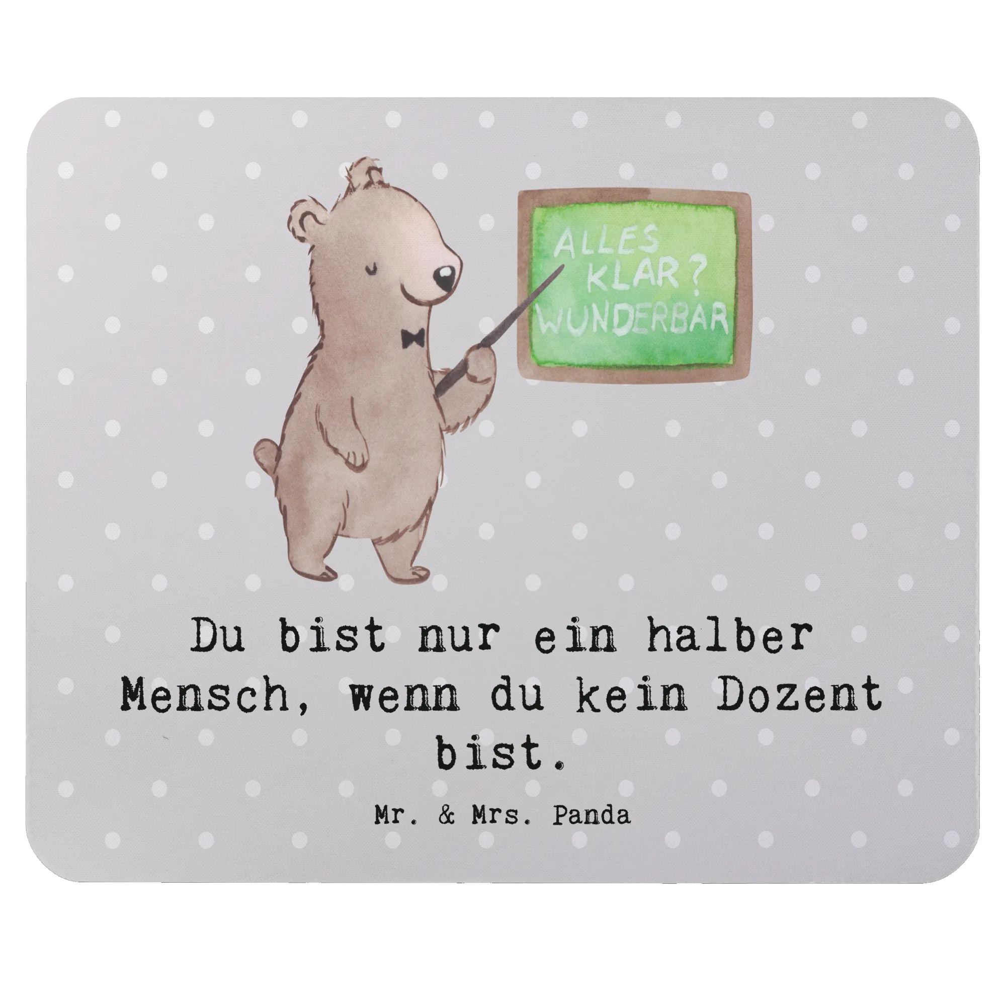 Das ausgefallene Design zeigt einen niedlichen Bären, der an einem Tisch steht und die Herzen aller Dozenten und Professoren höher schlagen lässt. Mit dem Spruch "Du bist nur ein halber Mensch, wenn du kein Dozent bist." bringt dieses Mauspad nicht nur Freude ins Büro, sondern auch ein Lächeln ins Gesicht!