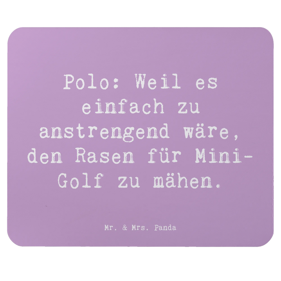 Entdecke unser einzigartiges Mauspad mit dem charmanten Motiv "Polo: Weil es einfach zu anstrengend wäre, den Rasen für Mini-Golf zu mähen." von Mr. & Mrs. Panda! Dieses stylische Mauspad ist nicht nur ein echter Hingucker, sondern auch extrem funktional und perfekt für deinen Arbeitsalltag oder das Homeoffice.