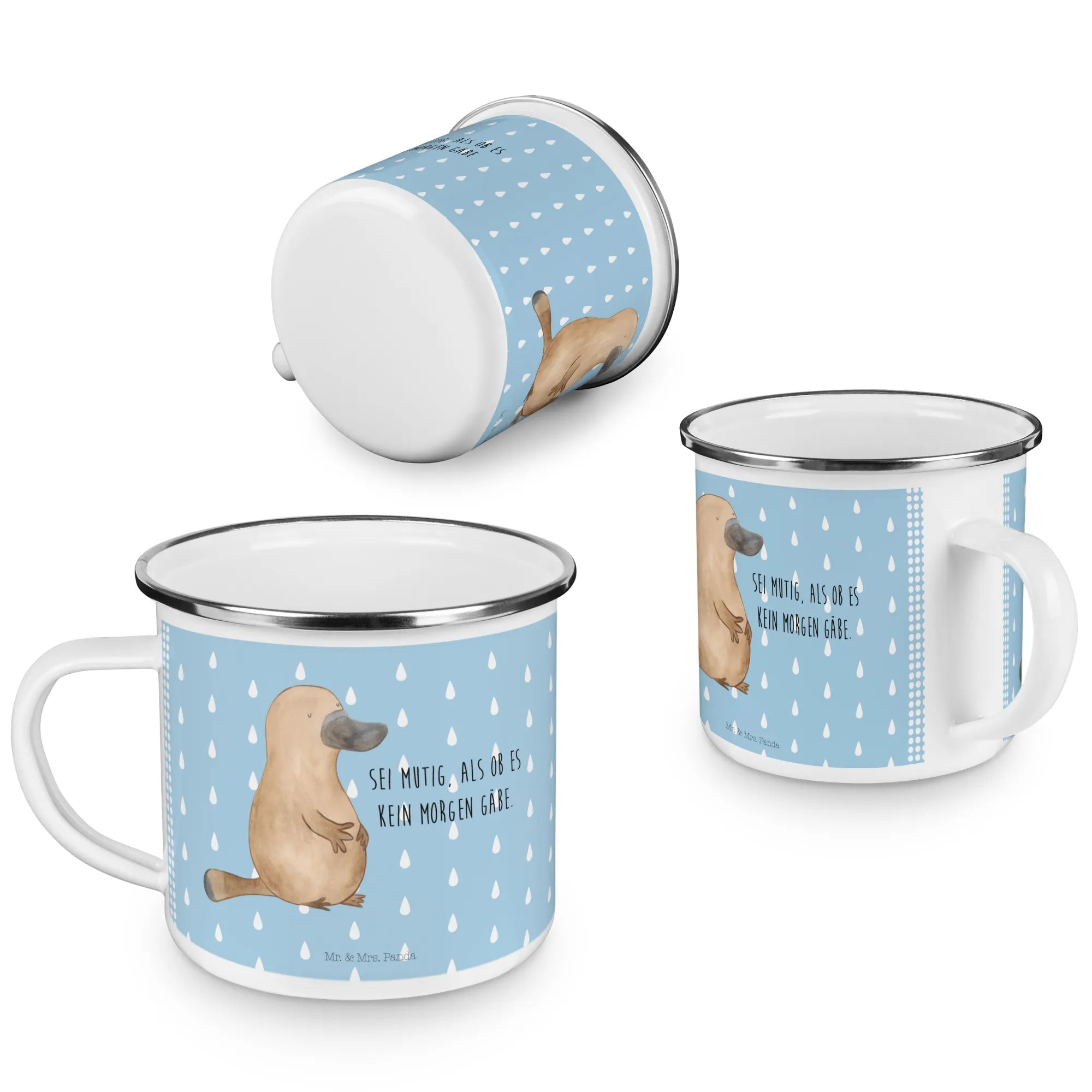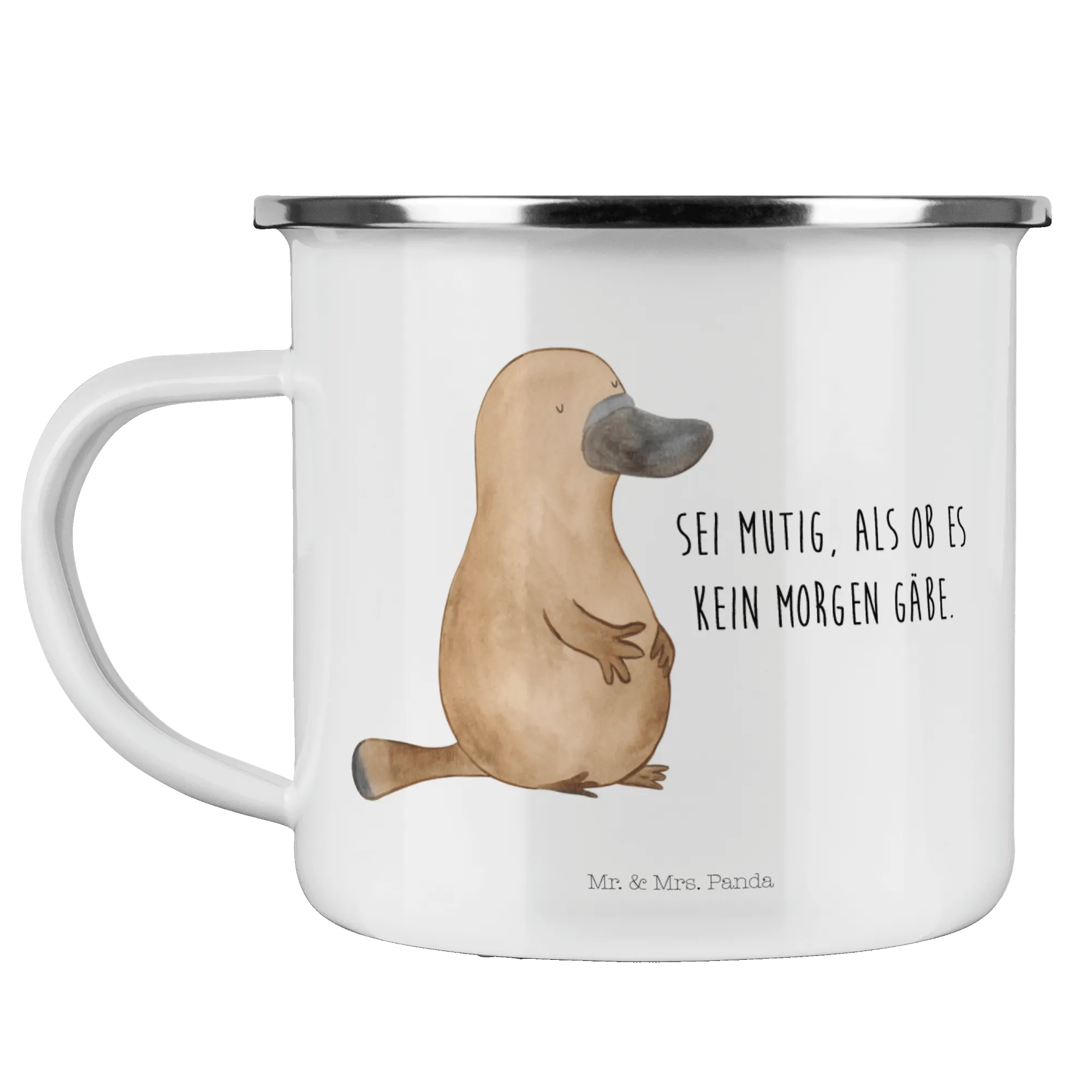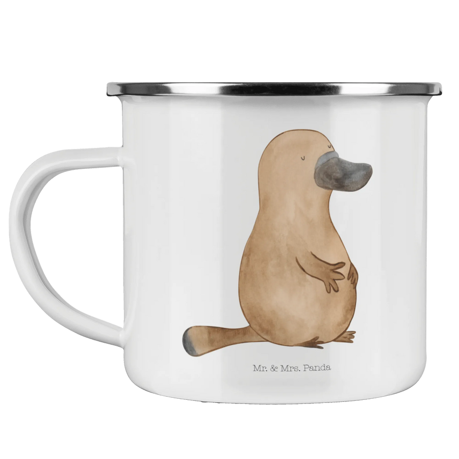 Entdecke die perfekte Camping Emaille Tasse mit dem niedlichen Schnabeltier-Motiv von Mr. & Mrs. Panda!
