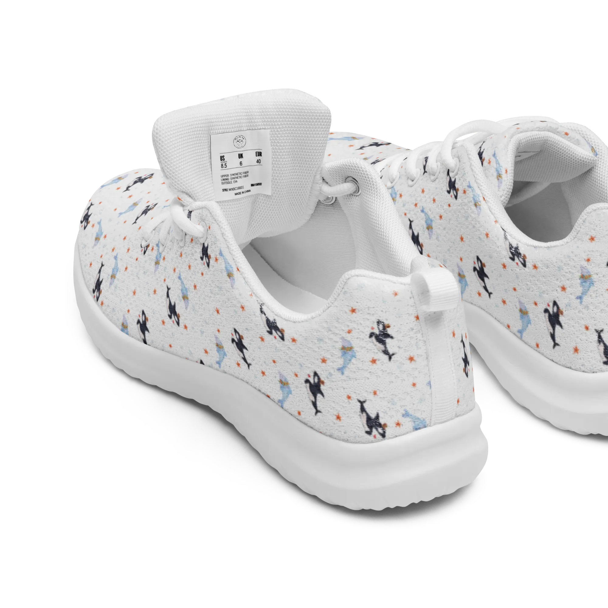 Das Motiv Orca Zylinder aus unserer beliebten Meerestiere Kollektion bringt eine ganz besondere Magie in deinen Alltag. Ein freundlicher Orca mit einem schicken Zylinder auf dem Kopf und einem kleinen roten Fisch an seiner Seite erinnert dich daran, dass das Leben voller Freude und Überraschungen steckt. Der Slogan 'Konfetti und Glitzer für alle!' unterstreicht diese lebensfrohe Einstellung und macht diesen Damen Sportschuh zum perfekten Begleiter für alle, die das Leben feiern. ✨