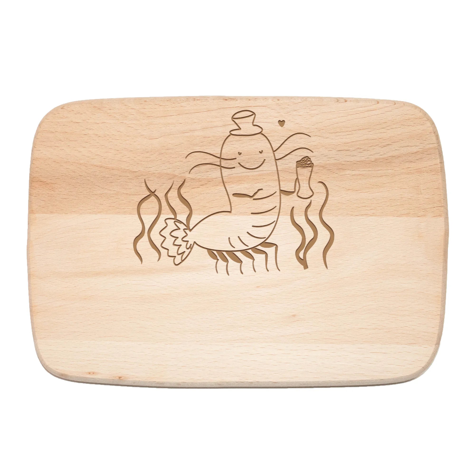Das liebevoll gestaltete Motiv zeigt einen fröhlichen Hummer mit einer goldenen Krone, der stolz ein Glas mit einem schäumenden Bier in seinen Scheren hält. Umgeben von welligen, grünen Seegras-Elementen und einem süßen kleinen Herzen, strahlt dieser Hummer pure Lebensfreude aus. Ob als Deko in der Küche oder als praktisches Brett zum Schneiden und Servieren, es macht jede Mahlzeit zu etwas ganz Besonderem.