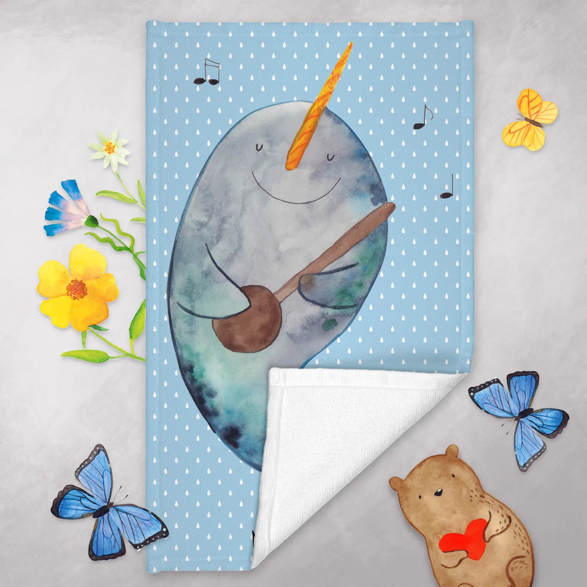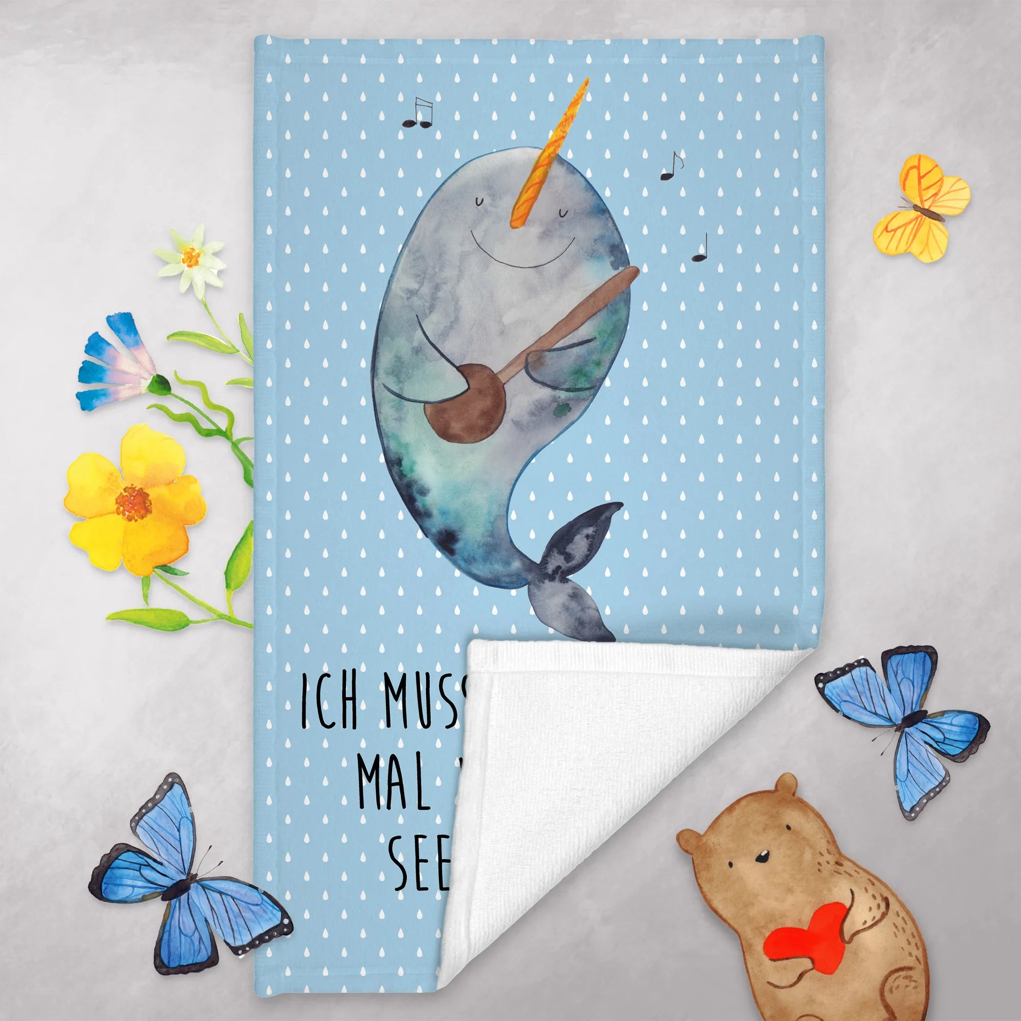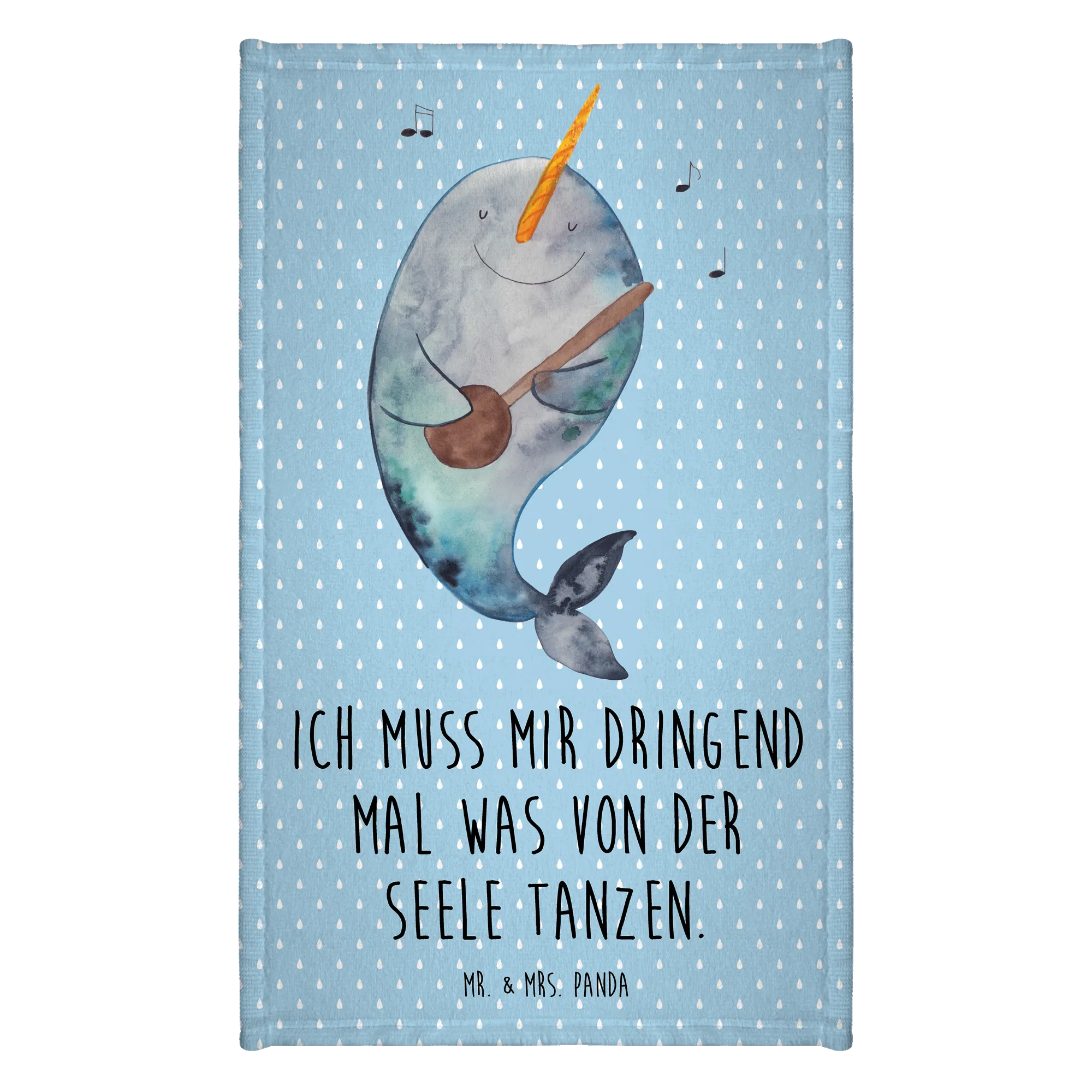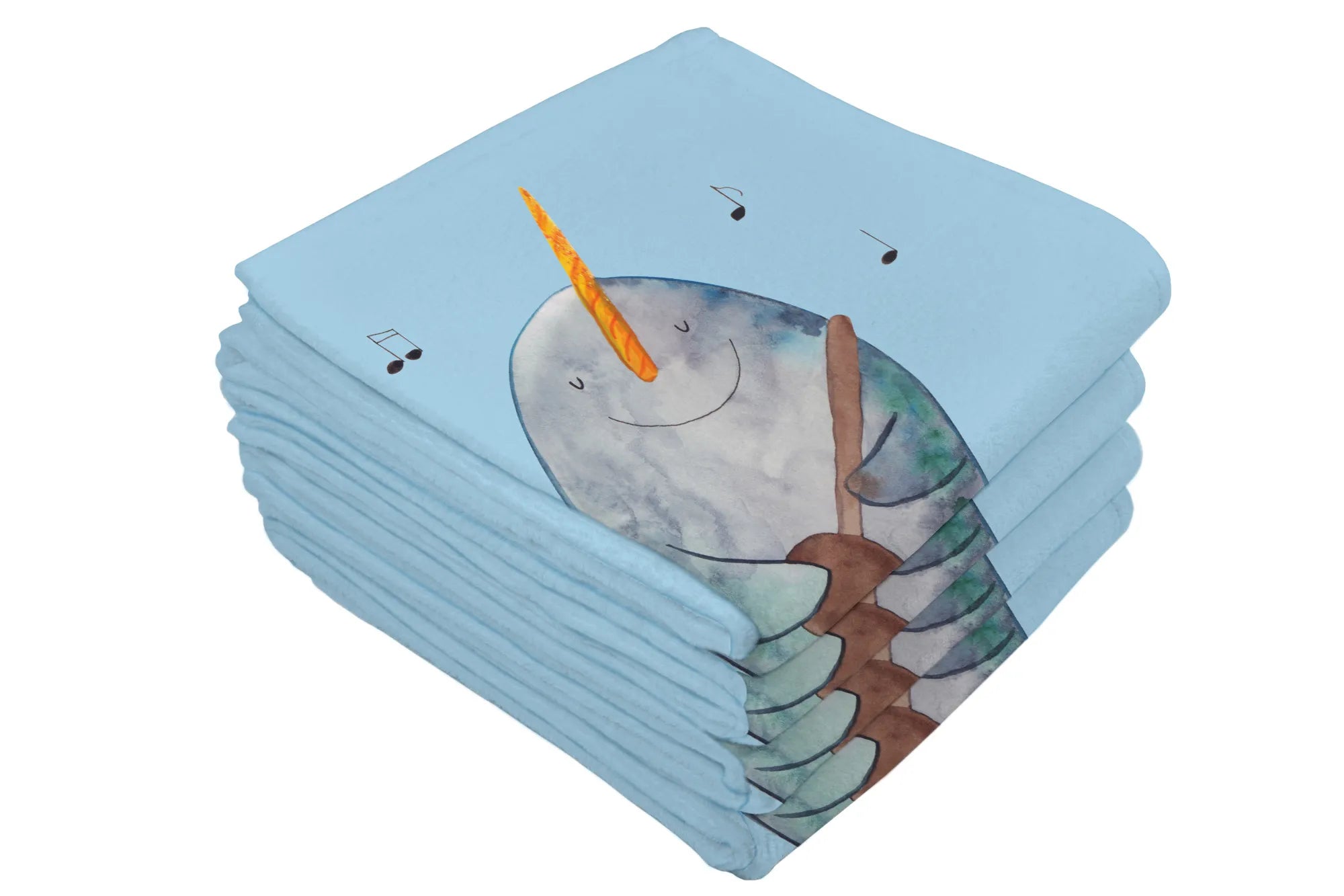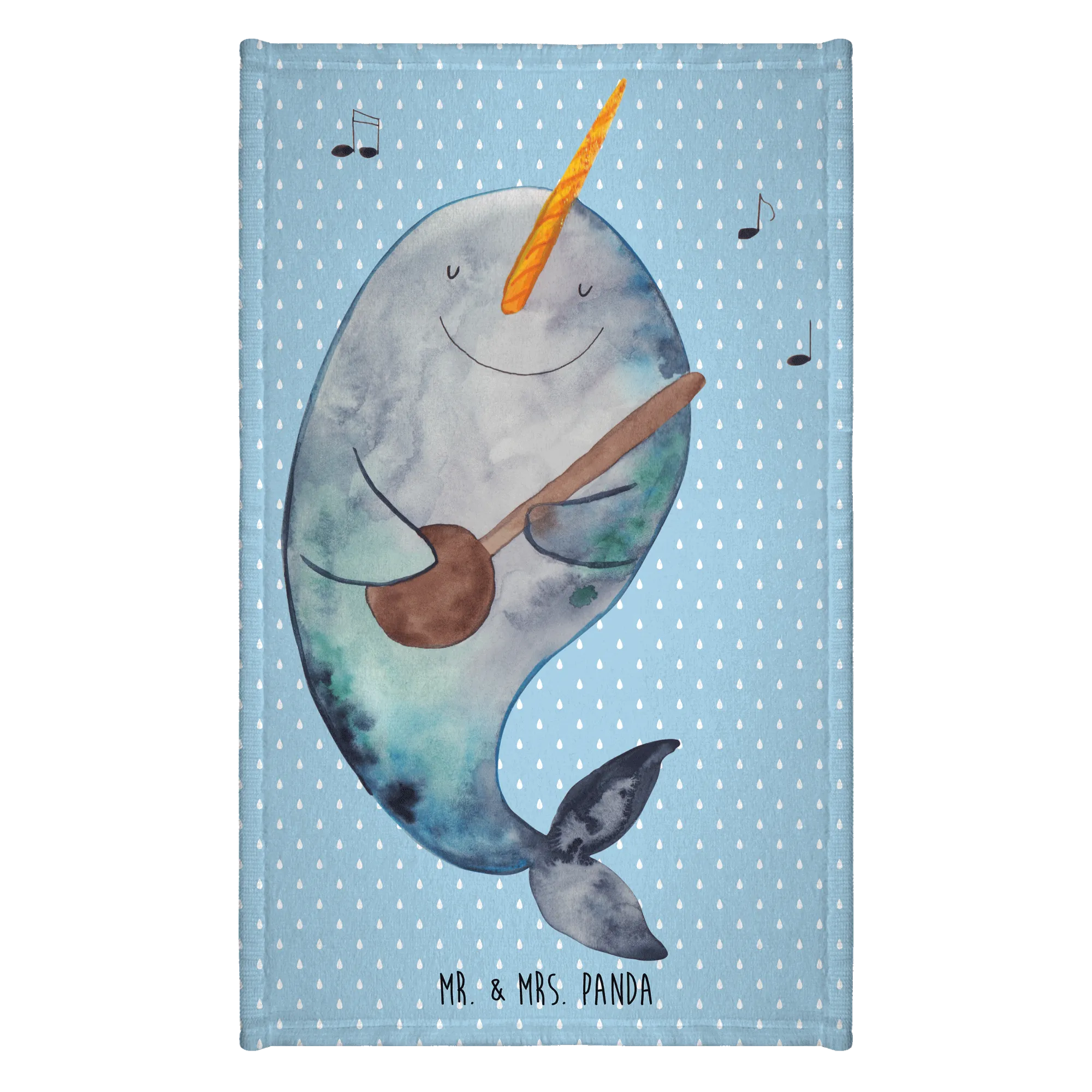 Das 50 x 100 Handtuch von Mr. & Mrs. Panda mit dem fröhlichen Narwal-Motiv und Gitarre ist der perfekte Begleiter für dein Badezimmer!