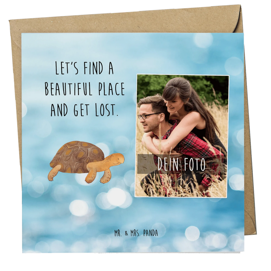 Die personalisierte Foto Deluxe Karte mit dem niedlichen Motiv 'Schildkröte marschiert' aus der Sammlung Meerestiere von Mr. & Mrs. Panda ist das perfekte Geschenk für all diejenigen, die das Abenteuer im Herzen tragen.