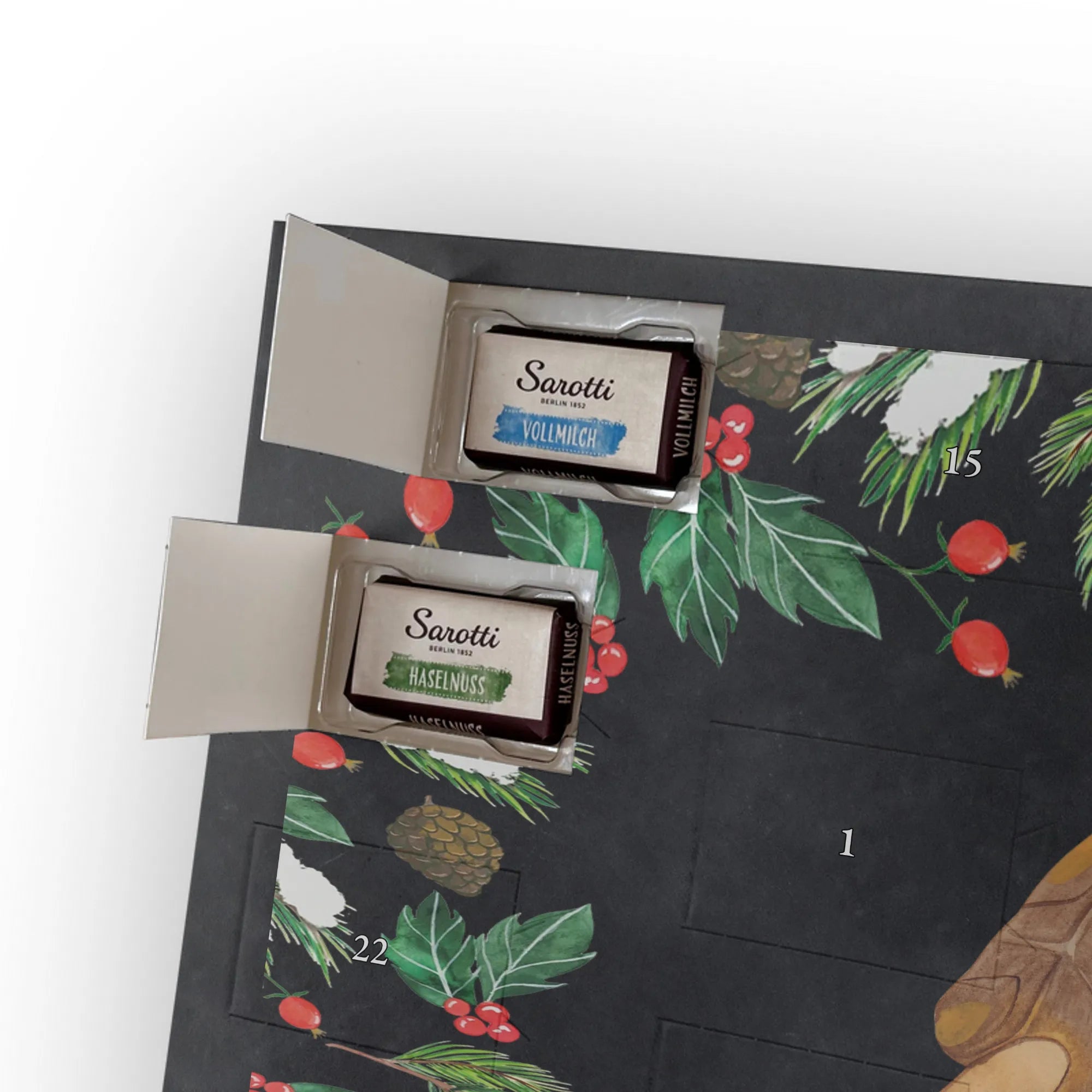 Wunderschöner Personalisierter Schoko Adventskalender von Mr. & Mrs. Panda – dein perfekter Begleiter durch die Vorweihnachtszeit! Dieser Adventskalender ist liebevoll bedruckt mit zauberhaften Motiven und witzigen Sprüchen von Mr. & Mrs. Panda und lässt sich ganz individuell mit deinem Wunschnamen oder Wunschtext personalisieren. Die brillante Druckqualität und die seidenmatte Oberflächenveredelung sorgen dafür, dass die Farben schön leuchten und sich der Kalender edel anfühlt. Auch die Seitenflächen sind bedruckt, sodass er von allen Seiten ein Hingucker ist. Maße: 355 mm x 245 mm x 11 mm. Eine besondere Eigenschaft: Du kannst ihn bequem aufhängen oder aufstellen – je nachdem, wie du ihn präsentieren möchtest. Gefüllt ist der Kalender mit einer hochwertigen Füllung aus 24 einzeln verpackten Schokoladentäfelchen in vier köstlichen Geschmacksrichtungen. Insgesamt enthält er 107 g Markenschokolade von Sarotti® und Confiserie Heidel® in den Sorten Vollmilch, Nougat, Zartbitter und Haselnuss. Bitte beachte: Es handelt sich um einen Kalender gefüllt mit Sarotti® und Confiserie Heidel® Markenschokolade. Verschenke Freude, Individualität und süße Momente – ideal als Geschenk für Freunde, Familie oder dich selbst. Mit diesem persönlichen Adventskalender machst du jeden Tag im Dezember zu einem kleinen Fest.